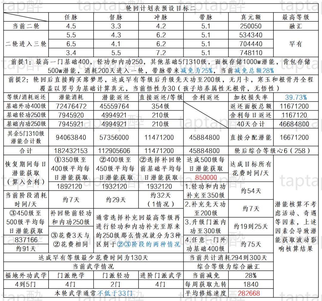那么在于带脉上一级差距主要体现在了潜能分配上的差距,对于上一轮为了带脉等级多花费的时间(相较于事例一少花费了大约40天),从图表中来看还是值得的。