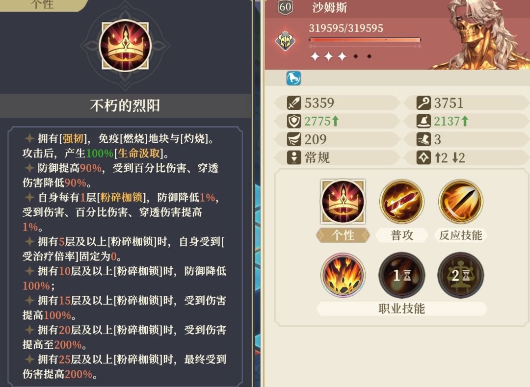 基础增益:自带【强韧】(免疫受伤、濒死),免疫燃烧地块与灼烧;攻击后 100% 生命汲取(用输出换血量);防御提高 90%,减伤 90%(层数较低时生存无忧)。