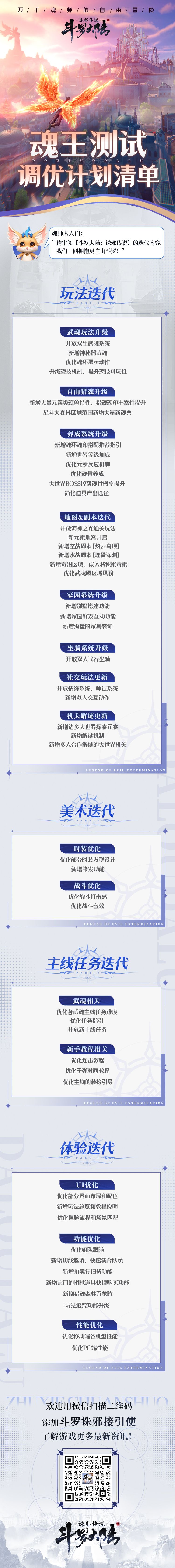 本次调优涵盖了武魂玩法、自由猎魂、魂骨&魂印系统、海陆空战斗副本、家园系统、美术升级、主线迭代、体验功能升级等大家关心的点,是又一次对《斗罗大陆:诛邪传说》的全面迭代优化!详细优化内容已整理成长图,欢迎各位魂师查阅!