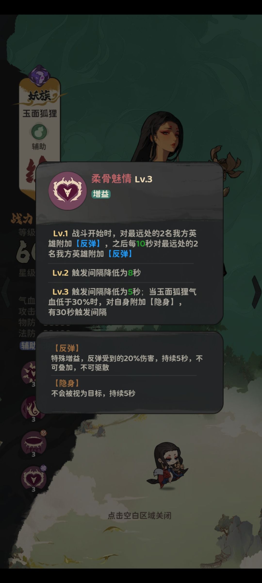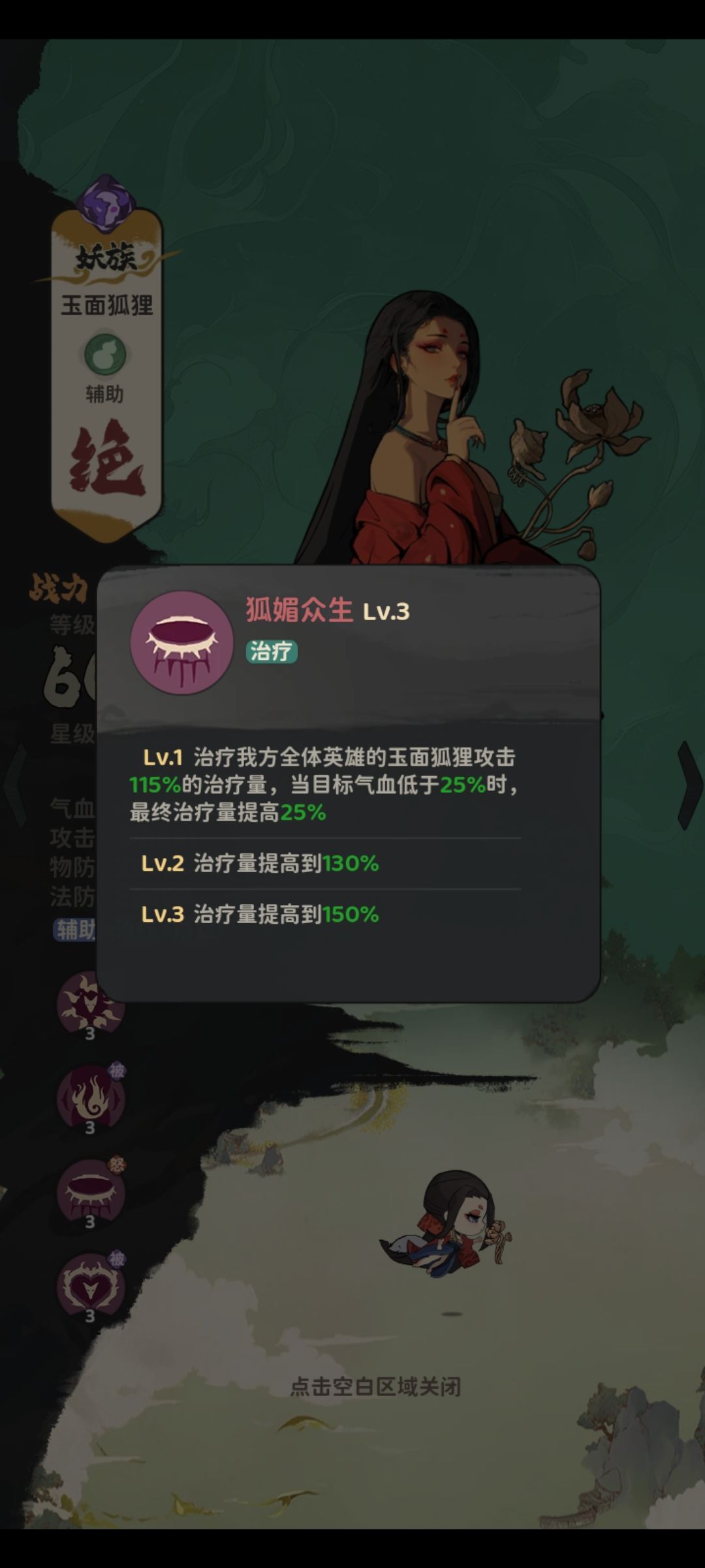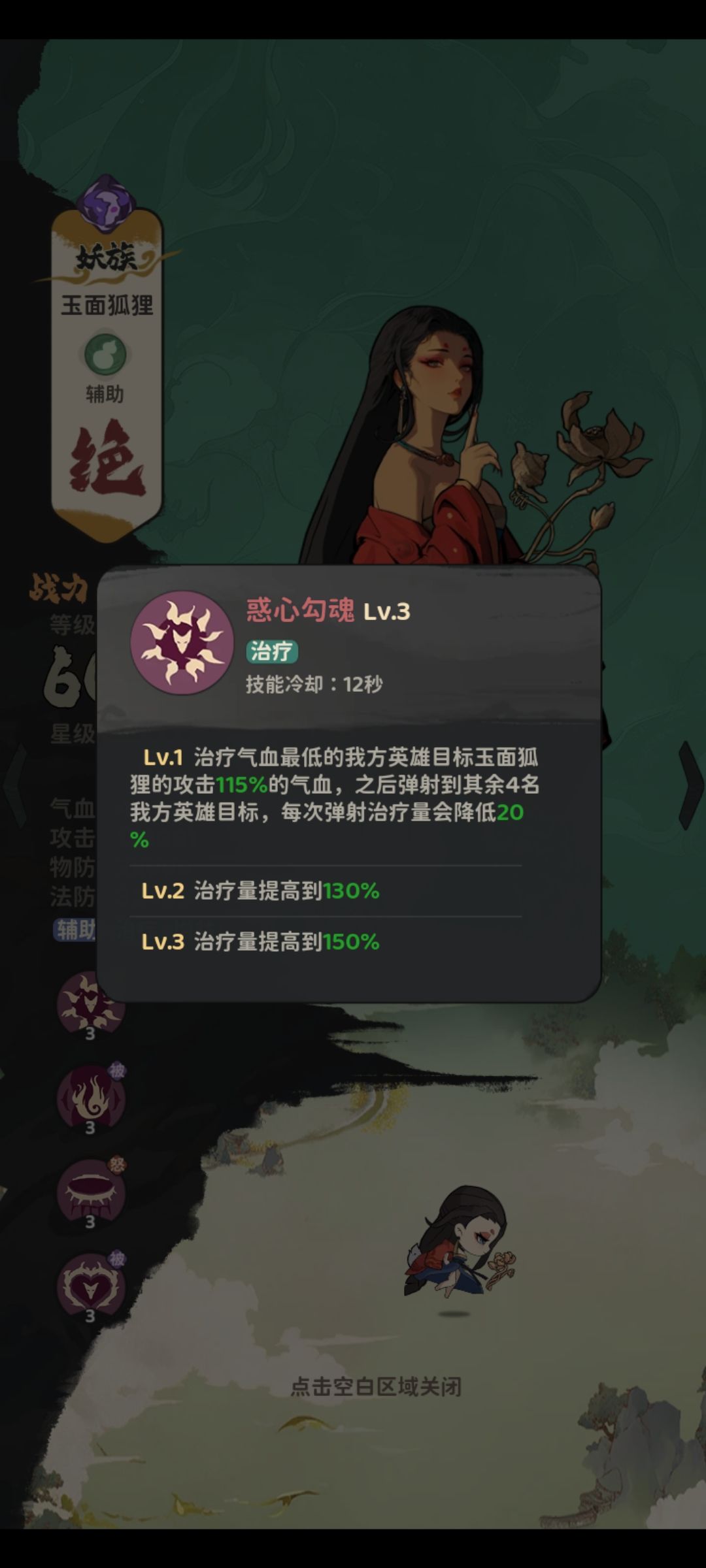 三核心奶妈之一,妖族核心奶,群体高额回血治疗束弹射回血,开局给离自己最远单位(前排)套反弹buff并残血隐身。