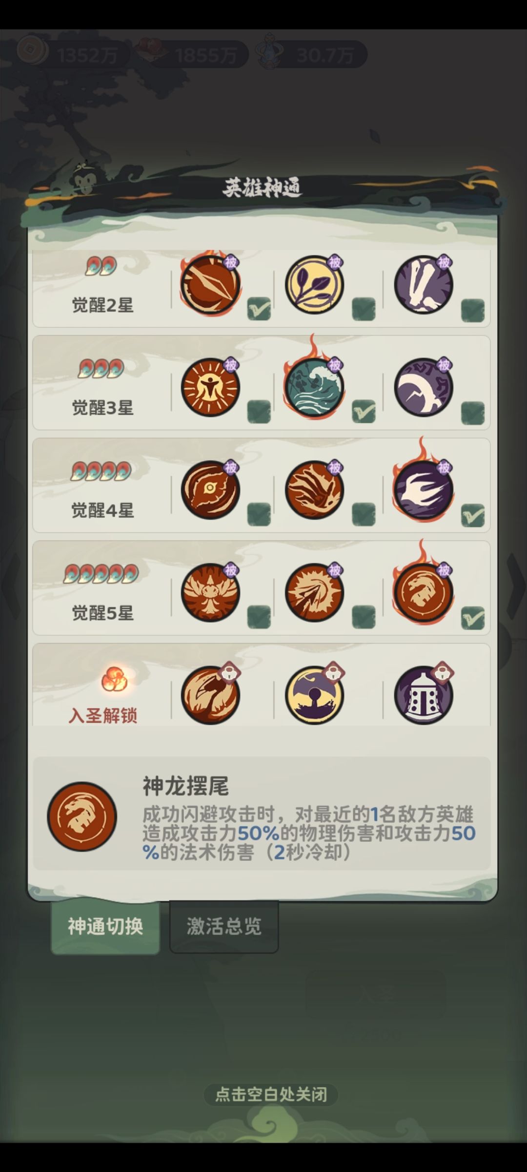 5觉:3神龙摆尾,成功闪避时对附近一名敌方英雄造 成50%攻击物伤和50%攻击法伤