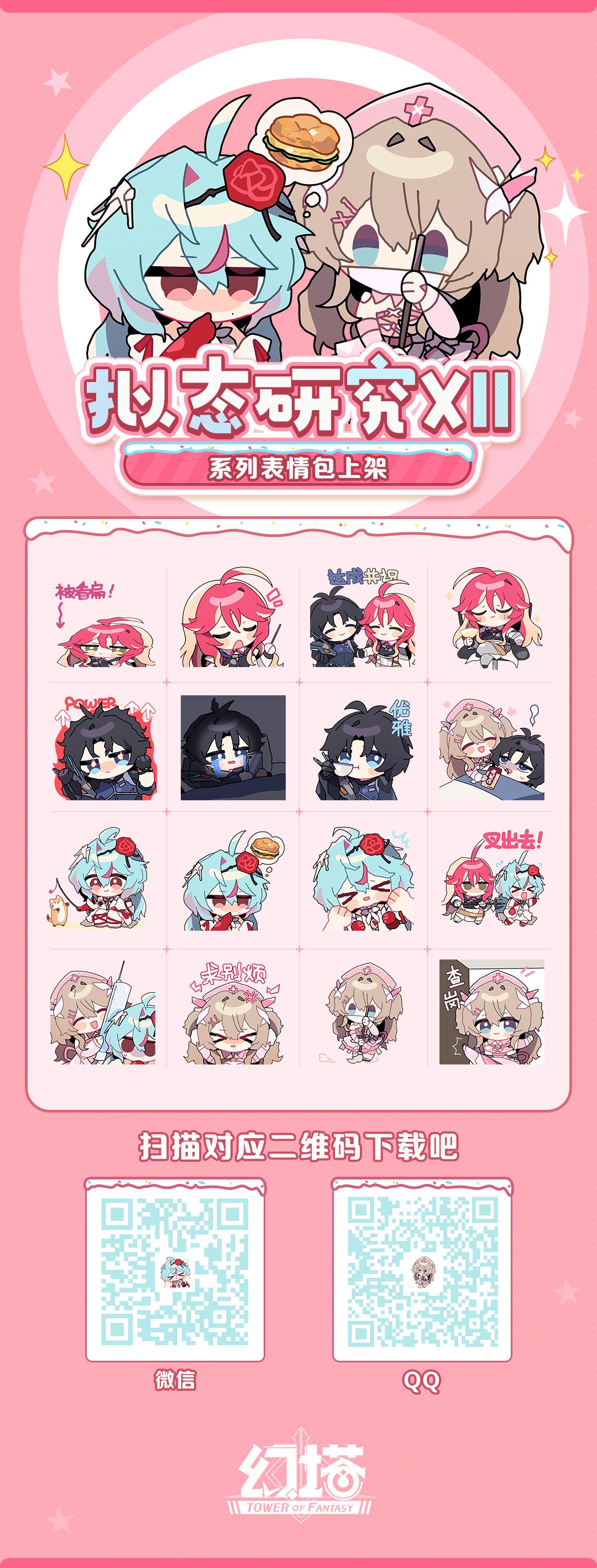 在【微信表情商店】以及【QQ表情商城】中搜索幻塔,或使用对应平台扫描下图中二维码,即可完成添加,快来带走可爱拟态们吧~