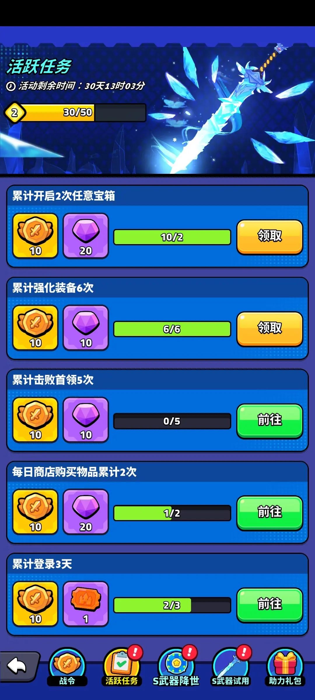 前期关卡简单,容易出现体力溢出的情况,可以先不去领章节宝箱的奖励里面有体力拿,当你卡关后就再去扫荡或者拿章节宝箱里的体力去扫荡,每日还有3次看视频免费扫荡的次数记得拉满收益最大化,武器活动与角色活动中活跃能完成多少是多少,最好是攒10连抽再去抽奖概率高些,同时看视频也有抽奖卷每日次数记得拉满,钻石多的可以去买500钻1卷的礼包