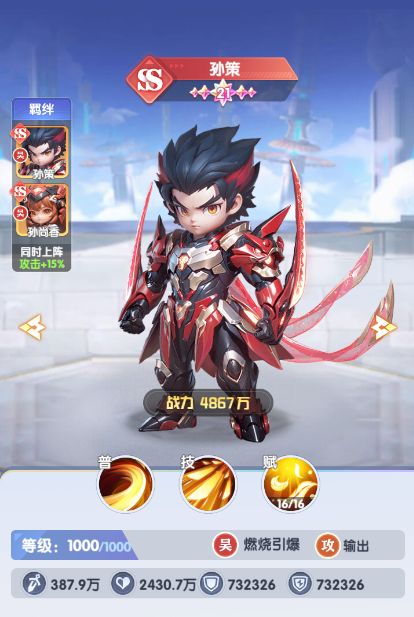 作为火系阵容的绝对核心,孙策凭借独特的【燃烧】联动机制与【战意】成长体系,构建了一套从"团队依赖"到"自给自足"的爆发闭环。