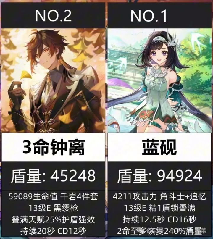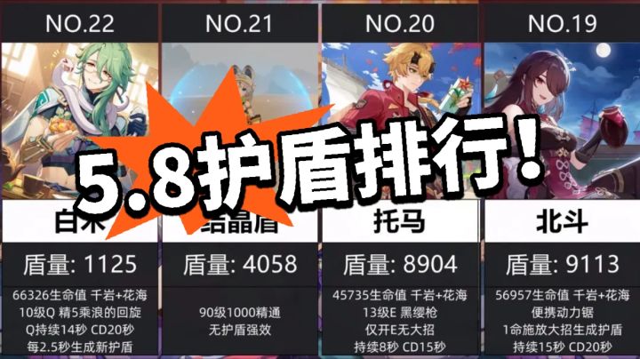 近日,随着原神5.8的开启已有几天时间 有多名博主统计出了角色护盾排行榜!