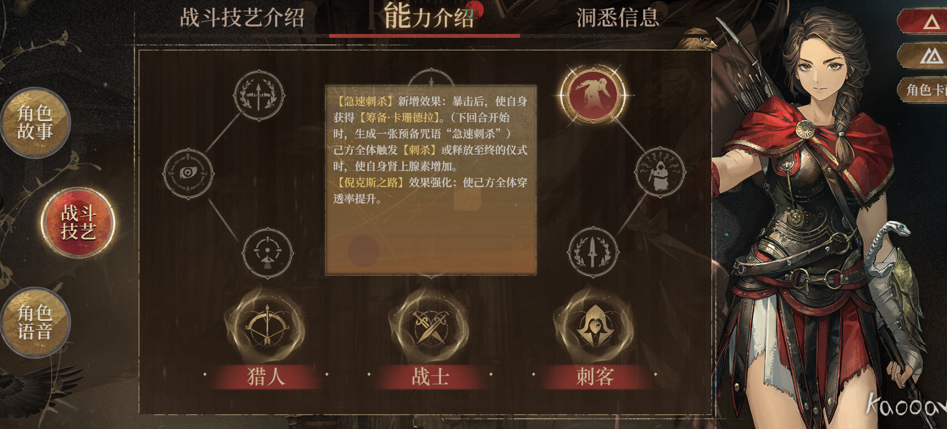 卡姐刺客分支,所有技能都是刺杀,还有筹备卡。如果卡姐的刺杀不能增加艾吉奥同步率,那艾吉奥出路基本只有毒爆,如果能暖机艾吉奥,那将会大大增加艾吉奥启动速度。