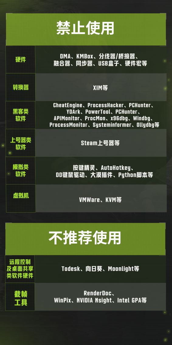 在运行《萤火突击》时如使用上述软、硬件,可能会被处以踢下线处罚;基于违规行为的严重程度,我们会对违规玩家采取角色封停、设备封停等更严厉的处罚!