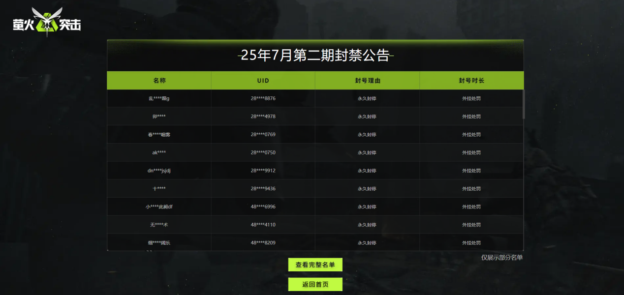 本期将对以下萤火虫进行处罚:对截至8月6日使用外挂、坐挂车、卡BUG的175716位萤火虫,进行永久封停。请各位务必谨记,远离任何形式的作弊行为,以免后悔莫及!