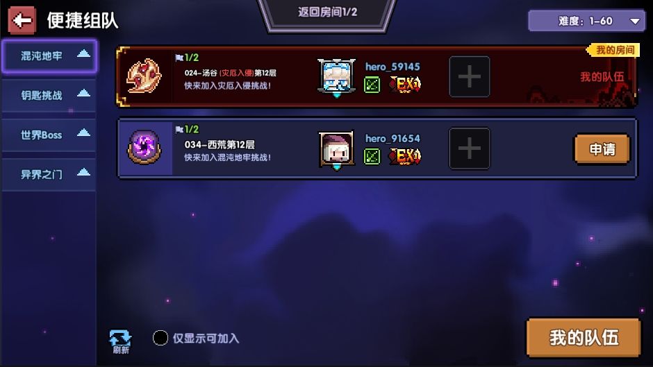 4、新增组队大厅功能,勇者们可以通过组队大厅,更便捷的在混沌地牢、灾厄副本等玩法中进行组队