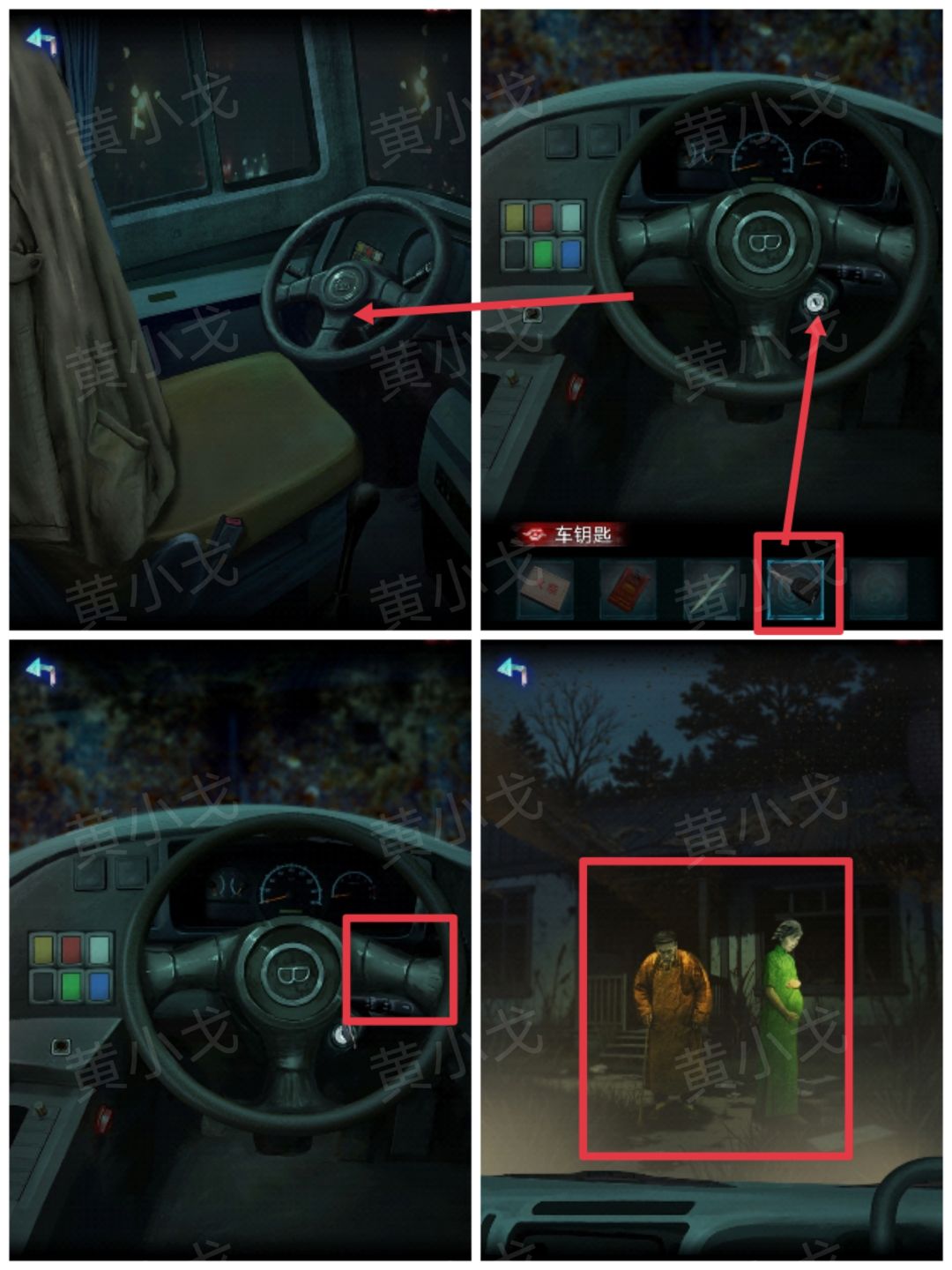 13.点击方向盘,用【车钥匙】启动车,打开车灯,查看前挡风玻璃上的纸人,获得线索