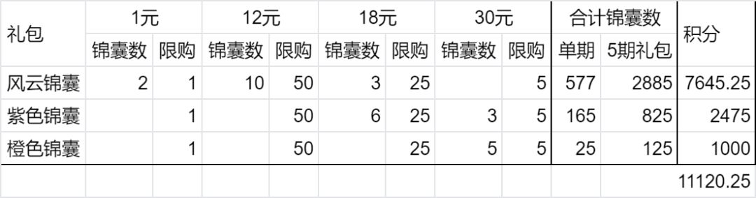 按照如上规则推算,风云锦囊开出旧卡的积分如下: