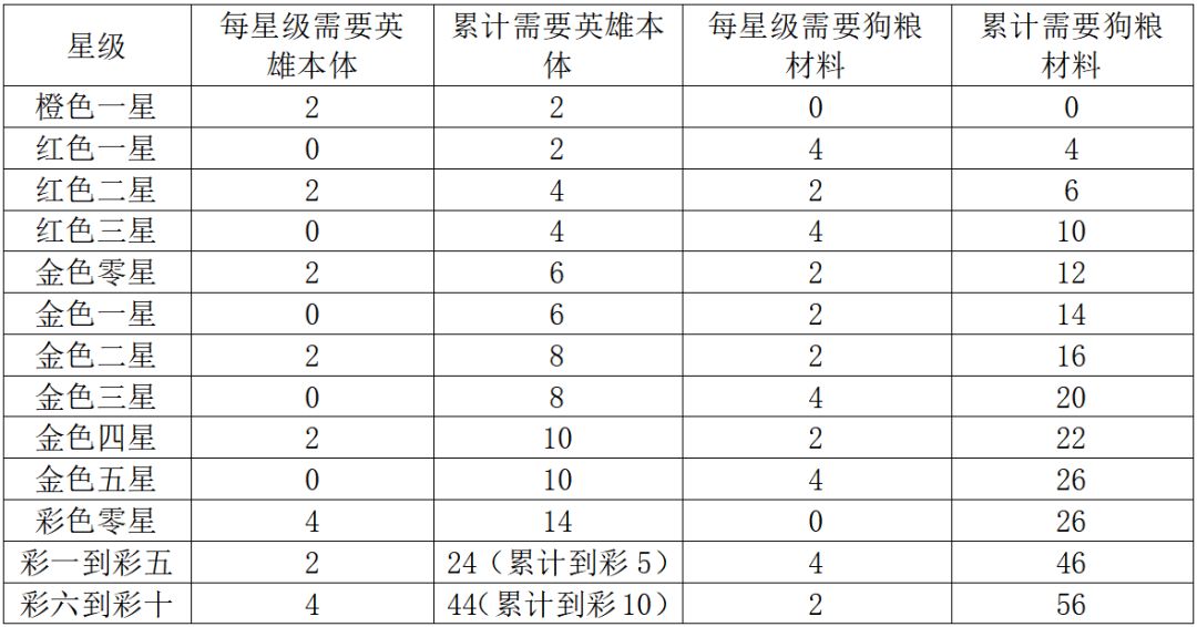 而英雄从最初的本体到彩色10星一共需要多少材料呢,我们一起来看看。
