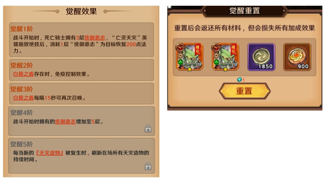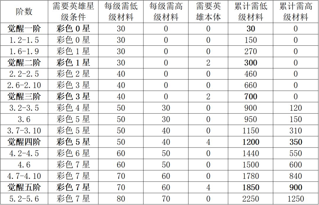英雄共分为觉一到觉5五阶,分别需要资源如下。