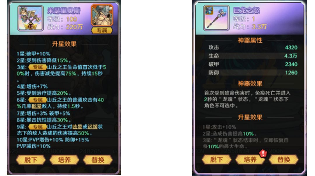 像死骑、山丘、女妖之王这几个关键英雄一定要用专属神器,因为有额外功能。每个神器到3、6、9星就有额外的专属技能。其他的法师、辅助脆皮建议都用巨龙之怒这个神器,关键时候扛住一轮免死保命,然后接下来战斗。当然巨龙之怒不需要高星,白板就行。