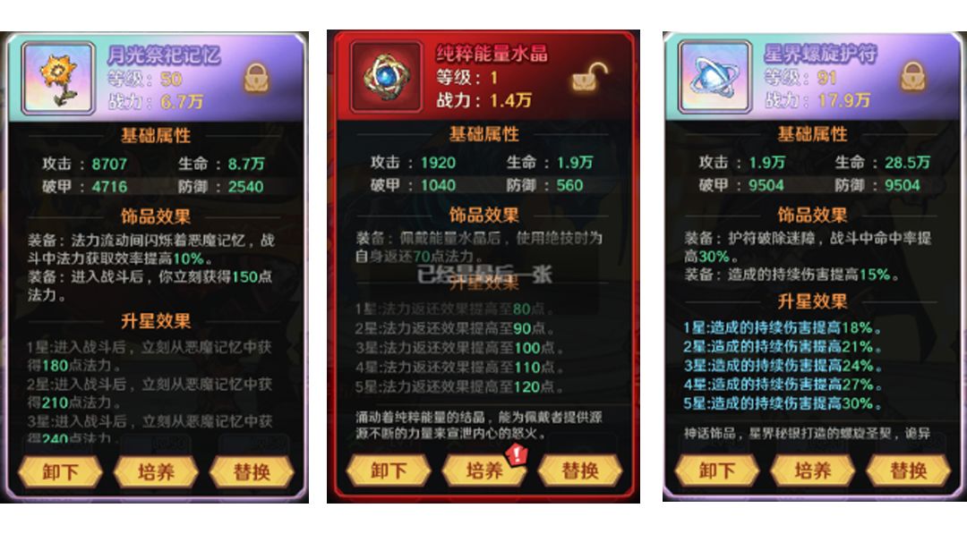饰品中要给大家推荐的是月光祭祀记忆和纯粹能量水晶,因为涉及到初始法力和战斗中法力获取,所以大部分英雄都需要,而这类饰品也不需要太高星,先人手一个即可。然后把输出类饰品等级先升起来,这样可以保证在战场上能快速释放技能,也有比较好的输出。