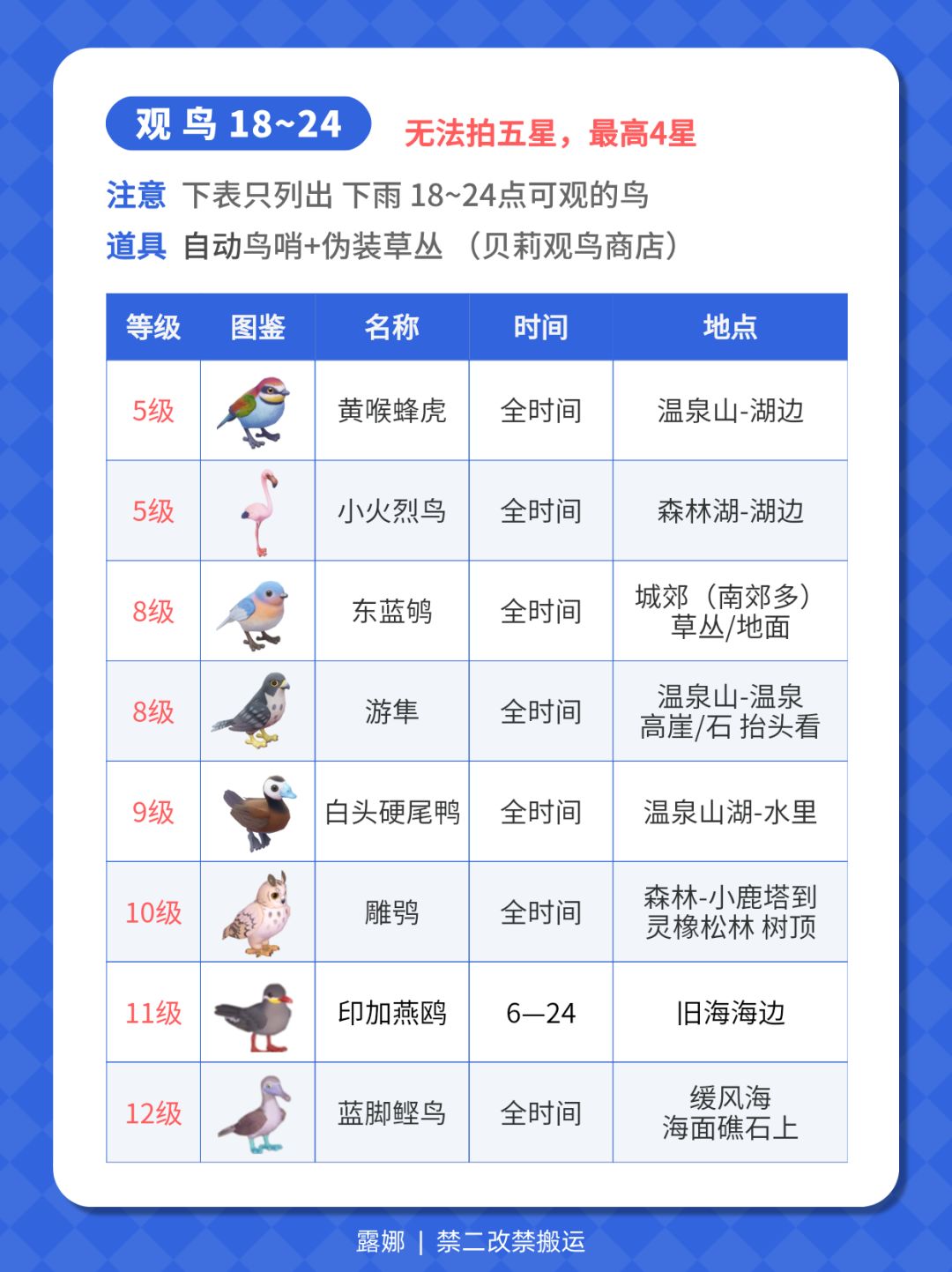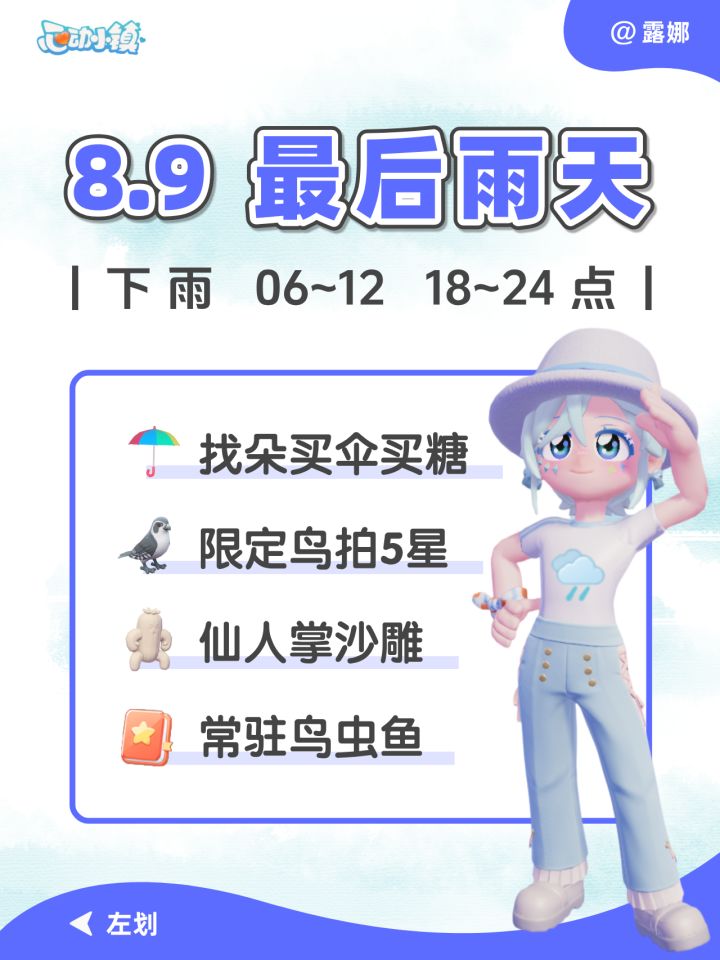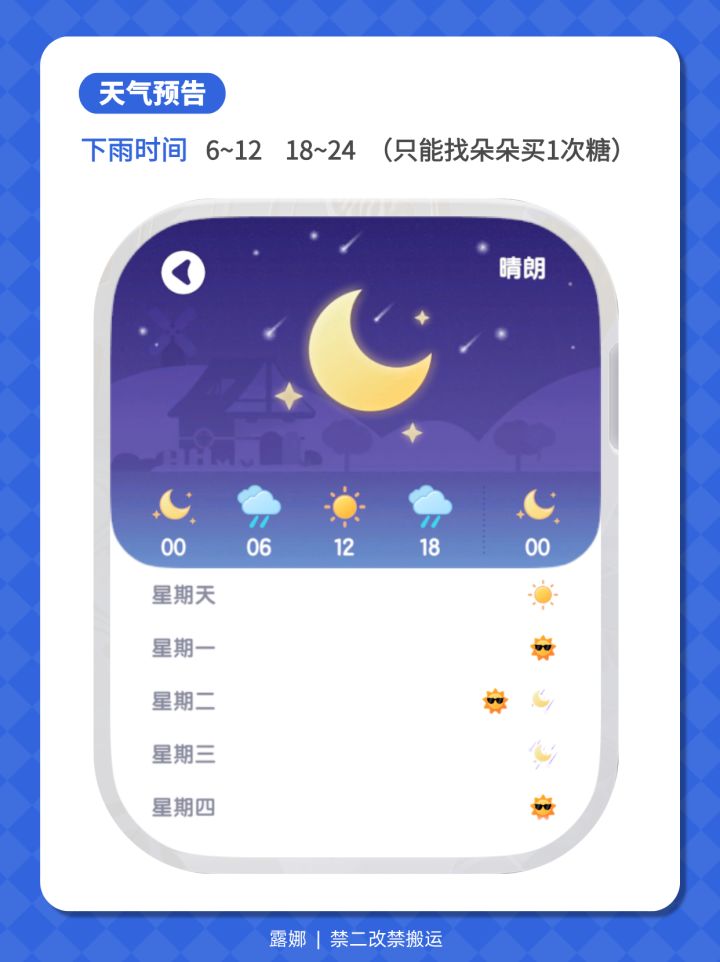 下雨时间 06~12 18~24 朵朵位置 见图 注意 只能买1次糖 必做 1、找朵朵:买糖、买伞、买浮云卷食谱 2、限定鸟拍五星 3、刷观鸟事件成就(百鸟归巢) 选做 1、常驻鸟拍五星 2、开常驻鸟虫鱼图鉴