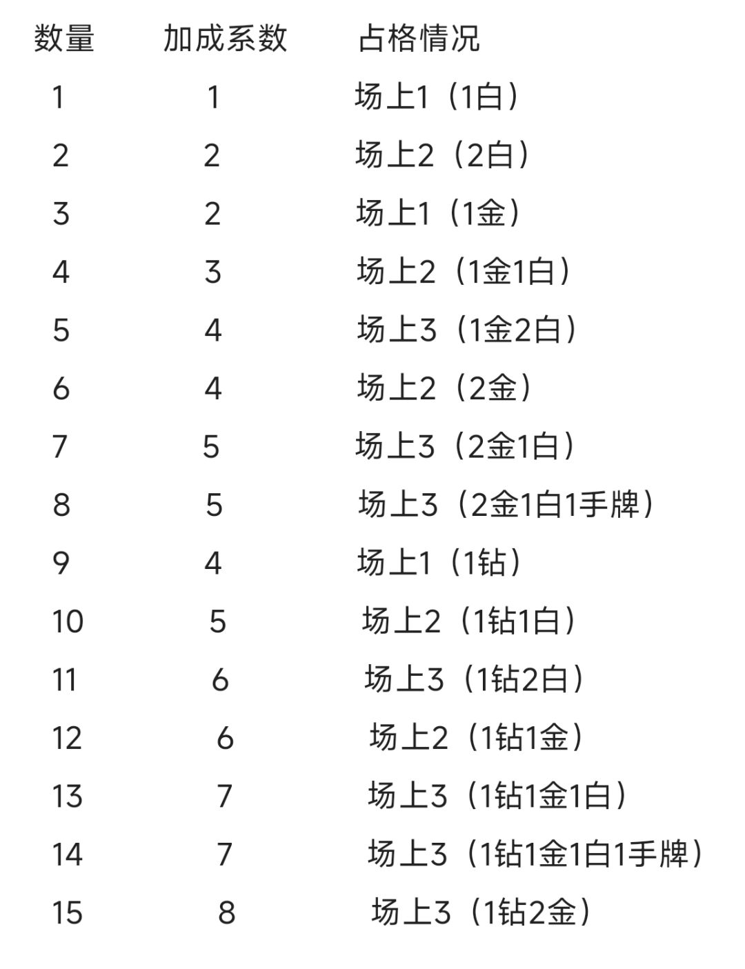 虎豹骑是不是越多越好?可以参考一下下面表格,普通白板虎豹骑能够1:1转化皇恩牌为自身数量,也就是2.5%的战力加成。金色1:2,钻石1:4,如果可以的话,场上的虎豹骑肯定是越多越好,但场上就七个空位,留给虎豹骑的地方也就2-3个,通过对比可以发现,在第5到6个虎豹骑以后,收益直线下降,付出的额外资源和收益完全不成正比,而且后期合成的虎豹骑整体强度不够,战力很虚。总体看来,维持两个金虎豹骑的收益明显更合适。(实际上,在构思这个攻略前,我一直都没想过这个问题,还是经常合成钻石虎豹骑的,但对比完这个表格后,以后我坚决只养两个)