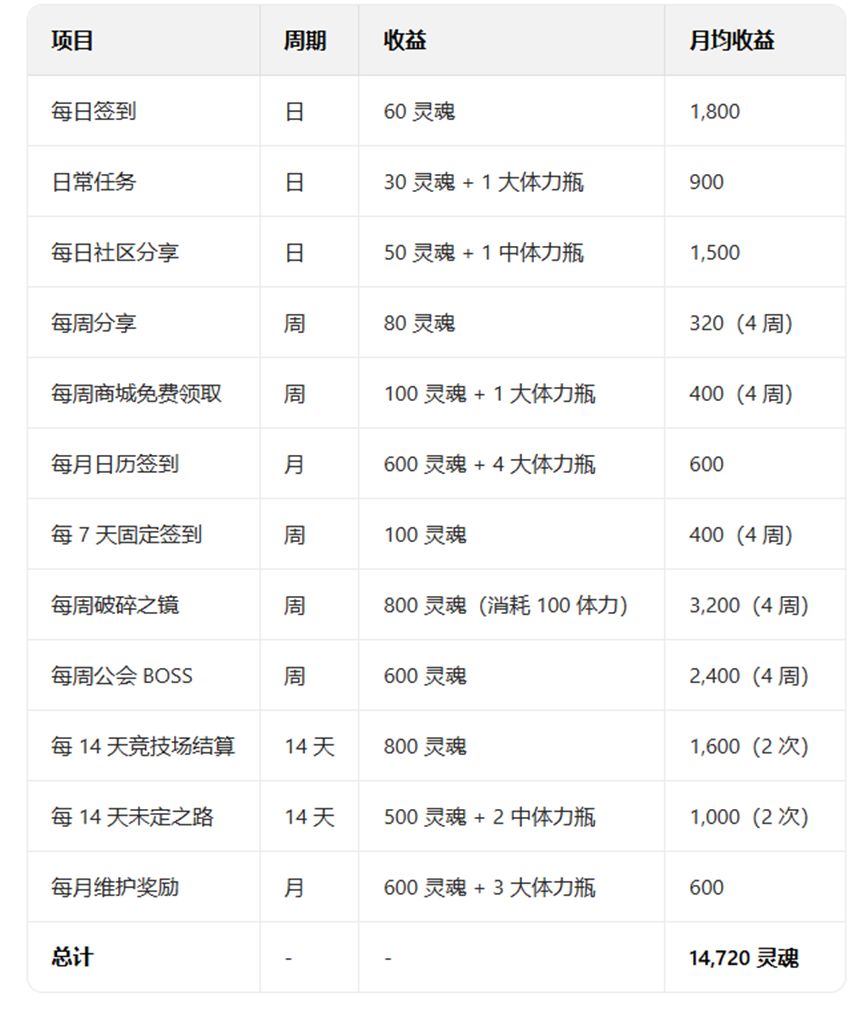 注 :暂不计算异界之镜和活动内产出只计算固定灵魂掉落,默认每月最少维护一次,实际以游戏内为主,月卡获取不计算(每日签到为商城每日礼包,每周分享为邀请新玩家每周分享)