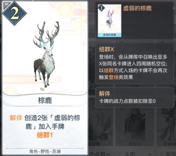结群1可以从牌库召回一张同类。解体就是战力为0时,可以入手两张小鹿,自带虚无效果,不算作回合一张的限制。