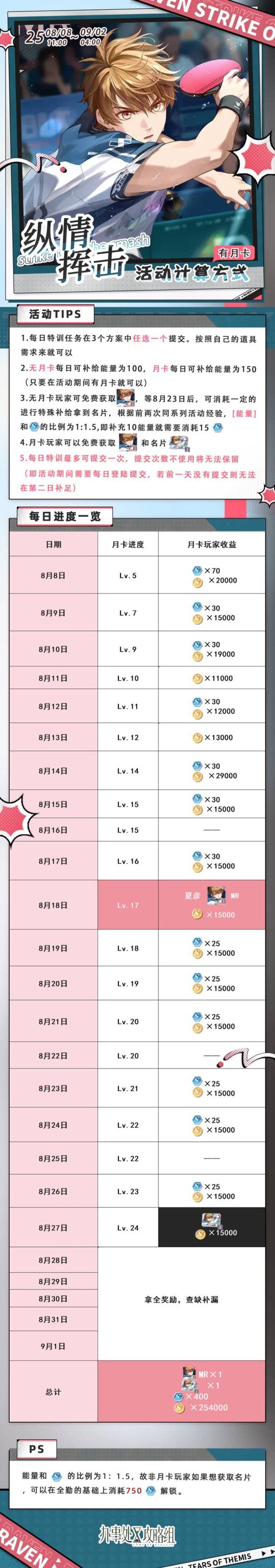 1.无月卡每日可补给能量为100,月卡每日可补给能量为150(只要在活动期间有月卡就可以)