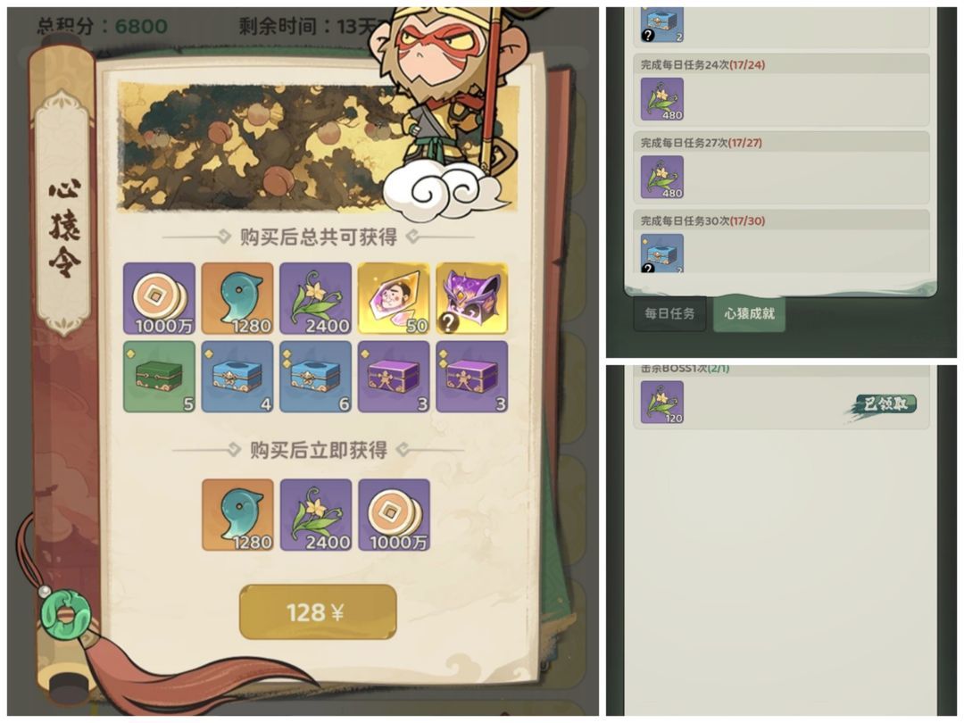图14.左侧为心猿令奖励,右侧为每日奖励和成就