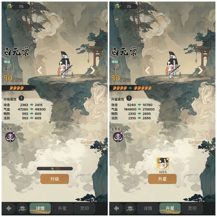 这里可以用三生灵草给灵侍升级,并能看到升级前后基础属性提升情况,这里基础属性提升与整体战力提升有个比例系数,每个号练度不同增幅不同,练度越高增幅越大,有机会单开贴说明。灵侍升星,50碎片可以激活,此时为0星,随后升1星和2星各需要25碎片,3星50碎片,4星5星各25碎片,6星50,7-8星25,9-11星50,12星75,13星50,14星50,15星75。