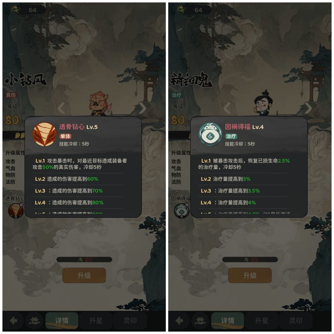 点击基础属性下方圆形技能图标可以查看灵侍技能,白无常根据在场英雄数量为佩戴英雄提供增减伤,以出场6个英雄计算,1级即可提供15%增伤,减伤意义偏弱毕竟减员代表着溃败,数值类技能,星级越高越好;黑无常为佩戴英雄提供一次复活机会,优先给刺客和前排输出佩戴,建议至少拉4星或7星,起码提供2-3个英雄佩戴,经过测试,圣尊二郎显圣真君佩戴黑无常阵亡优先激活法相,法相状态死亡触发黑无常技能,法相状态复活,很爽;青牛精技能是发怒气技后立刻获得怒气,1级为200,最高为400,1000怒气放大招,大招连大招,可惜每场只触发2次,不过前期快速秒人积累优势作用还是很大的,也是建议至少拉4星或7星,起码提供2-3个英雄佩戴,给刺客前排输出迅速秒人或者给白骨前期快速放大压制对面积累优势;碧水金睛兽技能普攻回复生命,星级越高作用越大,资源紧张情况下建议仅开图鉴。