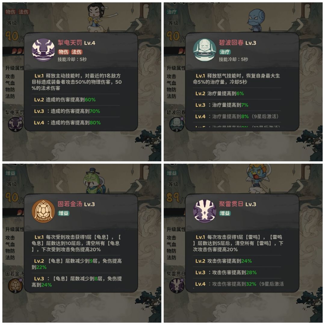 这里可以看到图鉴附加增益,圣品激活为6%,每增加一个星级增幅为1.5%,一般灵侍技能为攻击方面的图鉴为增伤,防御+奶方面的图鉴为减伤,雷公和奔波霸是例外。
