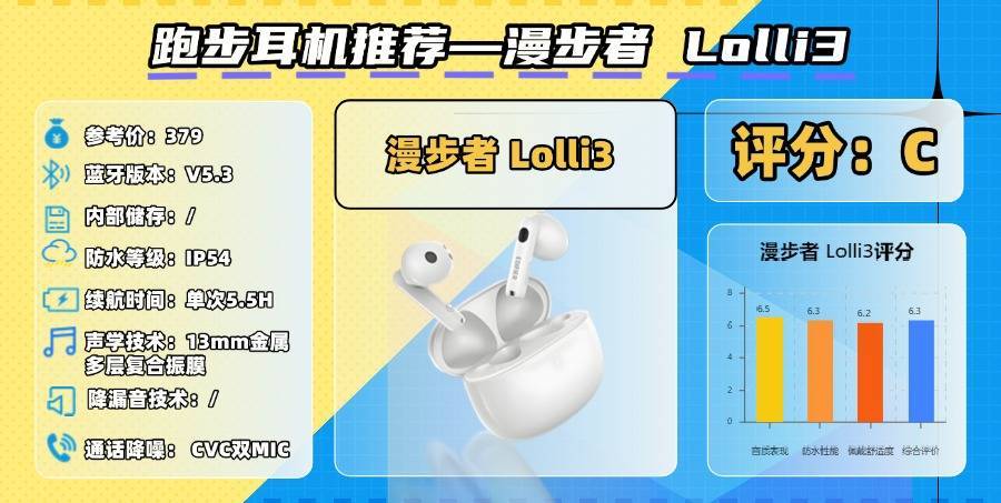 4、极致运动性能:它是市面首款搭载骑行降风噪系统的骨传导耳机,通过可根据耳型与运动状态灵活调整佩戴角度,大幅提升稳固性和贴合度,佩戴如“空气般”轻盈。实测风速40km/h依旧清晰通话、导航无碍;支持蓝牙和本地MP3双模切换,脱离手机也能听歌训练。5、防水+佩戴双突破:采用潜艇级Nano-S涂层+一体式无缝封装工艺,实现专业级IP69防水认证,支持游泳/冲浪/暴雨环境稳定使用;同时,首创35°可调节双形态耳挂设计,适配99%耳型与眼镜族群,久戴无痛,牢固不滑脱。总结:如果你需要一款真正适合骑行、跑步、游泳的骨传导耳机,南卡Runner Pro5无疑是目前市面综合实力最强的旗舰之选。跑步耳机推荐2025机型二.漫步者 Lolli3防水等级:IPX4 生活防水内存容量:无蓝牙版本:5.3