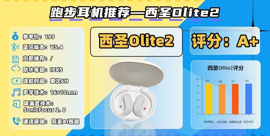 推荐理由:1、平价耳机的性能天花板:南卡Runner 4作为百元骨传导耳机中的性价比之王,外观设计小巧精致,采用液态硅胶包裹,配合仅26克轻盈机身,佩戴极为舒适且无压力。无论跑步、跳绳等大幅度运动,耳机都能稳固贴合,不易脱落,长时间佩戴依然舒适。2、音质表现媲美千元机型:搭载第3代響科技振子技术,显著提升音质清晰度和层次感。低频厚实弹性强,中频细腻温润,高频柔和不刺耳,三频均衡且细节丰富,带来沉浸式音乐体验。3、强悍连接与续航:配备全新蓝牙5.4芯片,连接快速稳定,基本无延迟卡顿。内置16GB存储支持离线播放,配合8小时续航与FC闪充技术,充电10分钟即可续航2小时,满足全天运动需求。4、卓越防水能力:IPX8军工级防水,结合纳米防水涂层,支持淋雨、冲洗、短时浸泡等极端环境,完全无惧汗水和雨水,适合多种运动场景使用,包括游泳和潜水。总结:南卡Runner 4凭借出众的性价比、舒适的佩戴体验和媲美高端机型的音质表现,成为百元运动骨传导耳机中的优选。无论是运动入门用户还是追求高性价比的运动爱好者,这款耳机都值得考虑入手,带来卓越的运动伴侣体验。跑步耳机推荐2025机型五.西圣Olite2防水等级:IPX4内存容量:无蓝牙版本:5.4