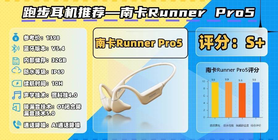 优秀的抗衰减能力,才能保证在日晒、震动、汗水等高频使用下,依旧保持良好状态,不出现音质下降、电池续航急剧缩水等问题。二、公认最好的跑步耳机跑步耳机推荐2025机型一.南卡 Runner Pro5佩戴设计:行业首创35°可折叠耳挂降风噪设计防水等级:IP69级(支持游泳、冲浪、高压冲洗)内存容量:32GB本地音乐存储蓝牙版本:5.4