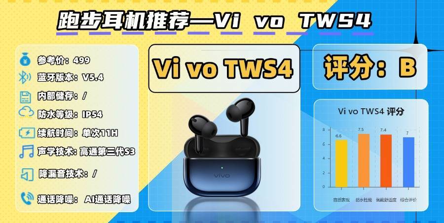 推荐理由:1、轻盈舒适的开放式设计:西圣Olite2采用ErgoFit 2.0工学设计,结合黄金三区支撑结构,贴合耳廓自然轮廓,机身仅重7.5克,外覆柔软液态硅胶,佩戴轻松且稳定。无论日常通勤还是中等强度运动,都能保证舒适度和稳固性,表现优于多数同价位竞品,但在剧烈运动时佩戴稳定性稍逊于封闭式耳机。2、音质表现均衡细腻:配备定制16×10mm动圈单元和SurroundWave™ 2.0空间声学技术,带来约270°环绕立体声场。低频扎实弹性良好,三频衔接自然,细节丰富,失真率控制在0.02%以内。内部TriAcoustic三腔体结构和SonicFocus 2.0定向传音技术有效减少漏音,但开放式设计导致漏音不可避免,影响公共环境使用体验。3、性能稳定连接:搭载蓝牙5.4芯片,支持60ms超低延迟,连接快速稳定。双麦AI ENC降噪确保通话清晰,适合日常通勤和办公使用。防水性能仅限日常防汗,运动中需避免大汗水侵袭。总结:西圣Olite2以亲民价格实现了开放式耳机的舒适佩戴和出色音质,适合追求轻盈自然听感的用户,尤其适合通勤及轻度运动场景。但因开放设计,漏音较明显且防护有限,不适合高强度运动或需要私密聆听的环境。综合来看,是百元价位内表现均衡的开放式跑步耳机推荐。跑步耳机推荐2025机型六.Vi vo TWS4 蓝牙耳机防水等级:IP54 生活防水内存容量:无蓝牙版本:5.4