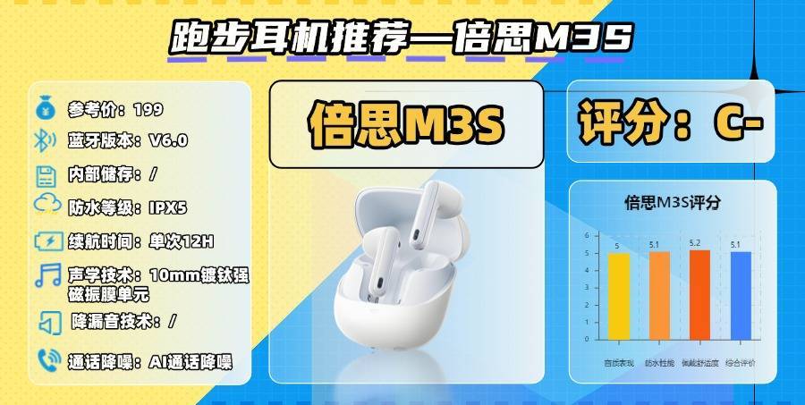 推荐理由:1、开放式设计,舒适自然佩戴感:声阔AeroFit Pro采用开放式架构,耳挂符合人体耳廓轮廓,重量分布均匀,佩戴稳定且舒适。适合长时间运动与办公场景,减少传统入耳式耳机带来的耳道闷热感和不适。2、音质表现均衡,低频突出:搭载16.2毫米大直径钛涂层驱动单元,结合BassUp低音增强技术,低频浑厚有力,中高频清晰,人声和乐器层次分明。但开放式结构导致漏音较为明显,安静环境下使用体验更佳。3、连接稳定且多设备支持:内置蓝牙5.3芯片,连接稳定且支持双设备同时连接,便于工作与娱乐无缝切换。但在复杂环境中偶有轻微信号波动。4、续航优秀,适合长时间使用:单次续航达16小时,配合充电盒续航可达46小时,满足全天运动及办公需求。充电频率低,使用便捷。总结:声阔AeroFit Pro凭借开放式佩戴体验和强劲低音表现,适合追求舒适且注重音质的运动用户。不过漏音和在嘈杂环境下音质表现有限,使用时需注意环境适配,综合来看是一款适合多场景切换的实用跑步耳机。跑步耳机推荐2025机型九.倍思M3S蓝牙耳机防水等级:IPX5防水抗汗内存容量:无蓝牙版本:6.0