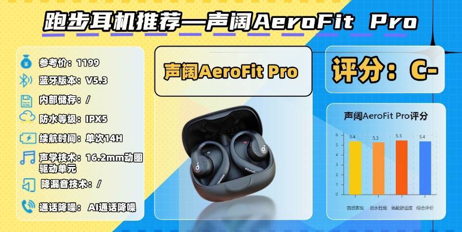 推荐理由:1、佩戴舒适但适合短时使用:漫步者ComfoClip采用软胶耳夹设计,初戴时舒适且贴合耳廓,适合日常轻度运动和办公使用。但长时间佩戴可能出现轻微压迫感,不太适合长时间剧烈运动或连续佩戴。2、音质表现中规中矩:音质整体清晰,低频表现一般,音量偏小,用户需调高音量以确保听清内容。对于复杂的音乐细节表现较弱,更适合播放轻音乐或用来接打电话,满足基础需求。3、蓝牙连接稳定,偶有卡顿:内置蓝牙5.2芯片,连接速度快且相对稳定。在多数环境下表现良好,但在信号复杂或干扰较多的环境中,可能会出现轻微延迟和偶尔卡顿现象,影响体验。4、防水性能适合日常运动:IP56级别生活防水,可防汗水和小雨,适合跑步、健身等轻度运动场景,但不适合水上运动或大汗量活动。总结:漫步者ComfoClip适合对佩戴舒适度有一定要求,且以日常轻运动或办公通话为主的用户。它的音质和连接表现满足基本需求,但续航和防水性能一般,偏向入门级使用,不建议用于高强度运动场景。跑步耳机推荐2025机型八.声阔AeroFit Pro开放式耳机防水等级:IPX4 生活防水内存容量:无蓝牙版本:5.3
