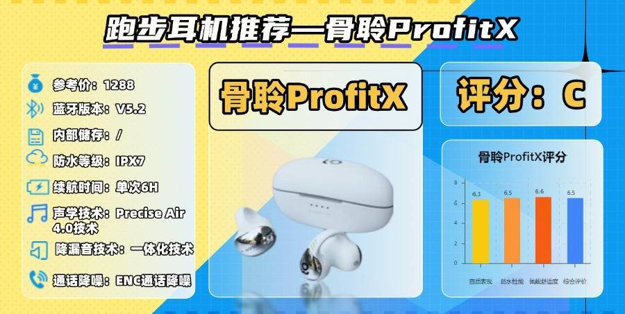 推荐理由:1、佩戴设计有待优化:骨聆ProfitX采用较大耳夹设计,单只耳机重量约7.3克,耳夹部分贴合较紧,虽能保证一定的稳固性,但长时间佩戴容易产生不适感,尤其在激烈运动时可能带来耳部压迫。2、低频表现突出,中高频不足:耳机低频震撼有力,适合喜欢重低音的用户使用,但中高频音质稍显模糊,细节不够丰富,高频部分存在轻微失真,整体音质表现不够均衡,影响音乐层次感。3、蓝牙连接体验欠佳:搭载蓝牙5.2芯片,连接速度相对较慢,且稳定性一般。在信号复杂或干扰较强的环境中,易出现断连或卡顿,影响运动时的连续体验。4、续航与防水基本满足运动需求:续航表现中规中矩,支持约6小时连续播放,防水等级为IPX5,基本应对汗水和雨水,但不适合长时间浸水的环境。总结:骨聆ProfitX虽在低频表现上有一定优势,但佩戴舒适度和音质平衡度不足,蓝牙连接也有待提升。适合对低频有偏好且对稳定性要求不高的运动用户,整体表现较为普通。