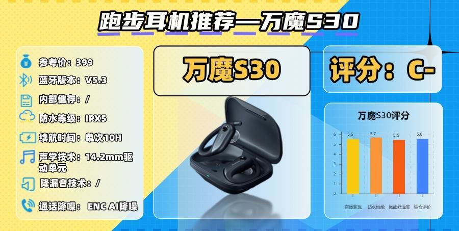 推荐理由:1、轻巧设计,长时间佩戴舒适:漫步者 Lolli3单只耳机仅重4.1克,整体机身轻盈,佩戴几乎无负担。其简洁外观设计配合品牌标识,辨识度适中,适合日常及运动时使用。耳机贴合耳廓,适合散步、慢跑等轻度运动。2、音质表现突出低频冲击:配备13mm液晶复合振膜动圈单元,结合较大声腔和背向导声结构,低频表现沉稳且有力,适合喜欢节奏感强的用户。但高频解析稍显不足,细节层次不够丰富,整体声音稍显平淡。主动降噪在室内效果明显,运动中效果一般。3、续航和连接表现:单次续航约6小时,搭配充电盒总续航24小时,满足日常运动需求。采用高通蓝牙5.3芯片,连接稳定,但游戏延迟约89毫秒,音画同步表现一般,游戏体验对延迟敏感的用户需谨慎。4、防水性能一般:具备IPX4生活防水,能抵御日常汗水和小雨,但不适合高强度水环境运动。总结:漫步者 Lolli3在轻便佩戴和低频表现上有一定优势,适合日常运动和轻量锻炼的用户。缺点是高频表现和游戏延迟有待提升,且防水能力较弱,不建议在剧烈或水上运动中使用。跑步耳机推荐2025机型三.万魔S30开放式耳机防水等级:IPX5 防水抗汗内存容量:无蓝牙版本:5.2