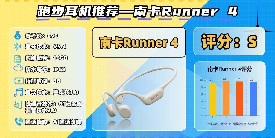 推荐理由:1、分体挂耳设计,佩戴稳固舒适:万魔S30采用分体挂耳式设计,紧贴耳廓,重量仅10克,长时间佩戴无夹头感,运动中稳固不易掉落。开放式结构使用户能自然感知环境音,适合户外跑步和健身时保持安全意识。2、音质表现均衡,低频浑厚有力:搭载14.2mm类钻石振膜动圈单元,配合低频增强算法,低音表现深沉而饱满,提升了音乐的层次感。定向发声设计减少漏音,保障运动中音乐体验的私密性。但开放式设计使得高频细节表现稍显不足,整体声场感受偏向自然舒适。3、续航持久,防水能力可靠:单次续航达30小时,满足长时间运动需求。IPX5级防水防汗设计,可应对汗水和雨水,适合多种运动环境。蓝牙5.2连接稳定,但在复杂环境下偶有轻微延迟。4、使用建议与不足:开放式设计虽提升环境感知,但在嘈杂环境中可能影响音质集中度。对密闭降噪有需求的用户可能不适合,且耳机不配备内存功能,需依赖手机播放。总结:万魔S30以舒适稳固的佩戴、均衡浑厚的音质及持久续航,满足日常运动和户外使用需求。缺点在于开放式设计带来的音质限制和无离线存储功能,适合喜欢自然环境感知的用户。跑步耳机推荐2025机型四.南卡 Runner 4防水等级:IPX8军工级防水,纳米防水涂层加持内存容量:16GB本地音乐存储蓝牙版本:5.4