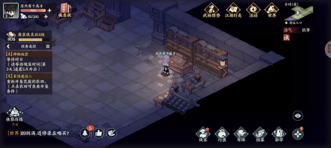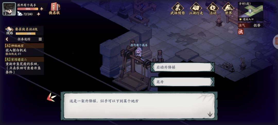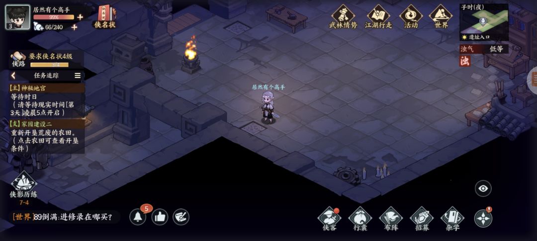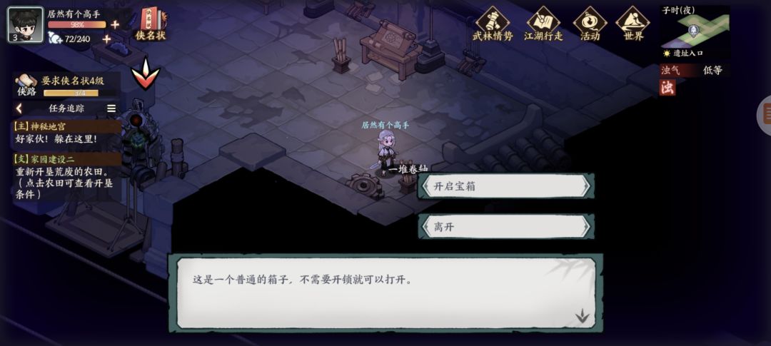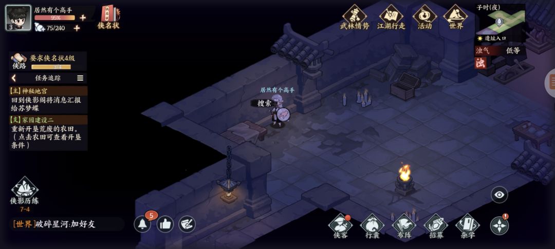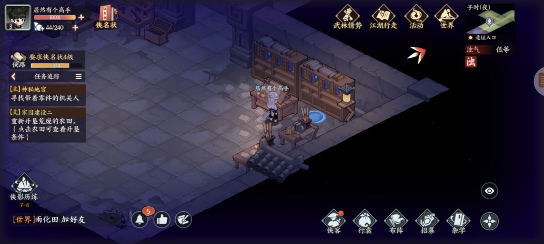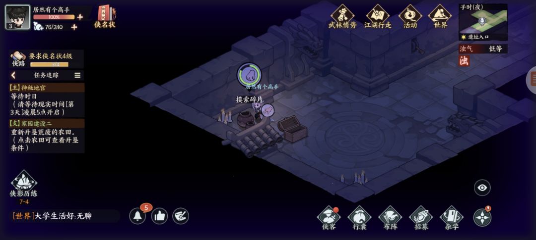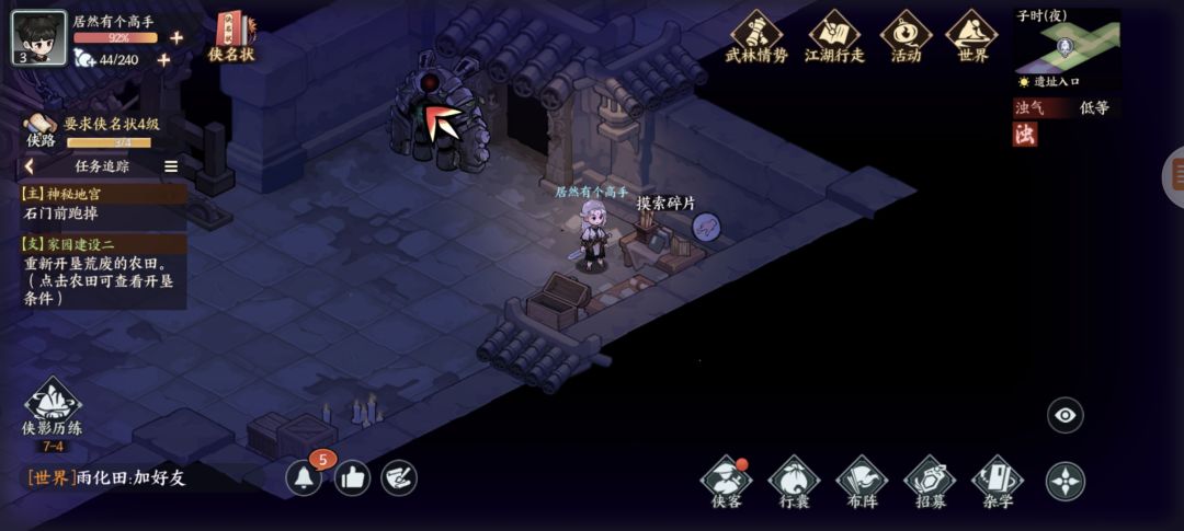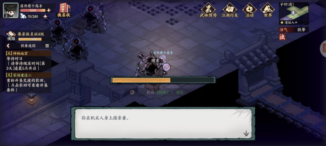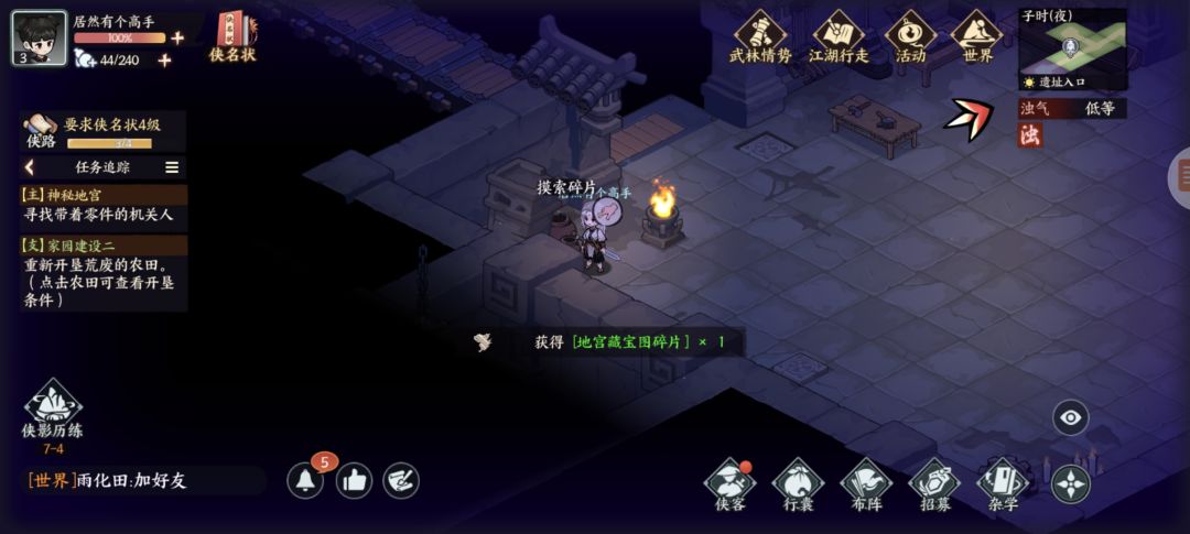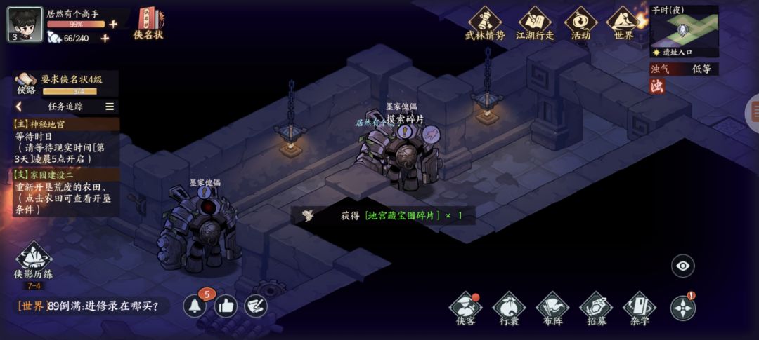 墨家遗迹:杂货买几个火折子(地宫里有一些地下或者墙上可以按下去的机关注意)图1探查得三角零件,图2开石门,图3得方形零件,复杂点的千机盘走法看我另个专门视频贴,修好的机关人新光圈暂时还不知怎么砸开墙。图4得地宫宝藏图碎片,左下按开关进入新房间搜索钥匙信息,图5探查得圆形零件,图6藏宝图碎片,图7宝箱开窗出个啥我没注意,图8升降梯先做完主线才能开启,地脉之心打完右下走过去可以开三个宝箱,交完主线任务再返回地宫图9拾取,图10打碎机关人,图11藏宝图碎片,图12元宝1两,图13按下机关打通后升降梯可用,图14藏宝图碎片(四张集齐了合成),图15绘画点。至此探索已完结,我进服晚一天,剩下的完成度要等现实时间玩家进服第三天了。