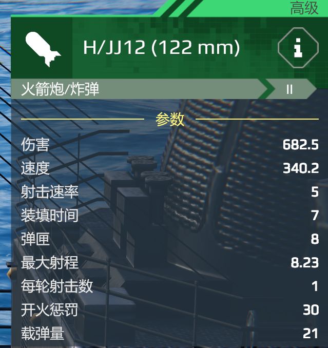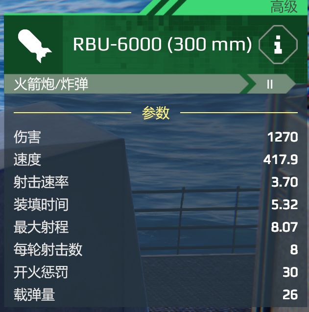 此火箭炮可以对舰反潜,还可以扫鱼雷。相比较于其他火箭炮单次发射8发火箭弹,有较高的反潜和扫鱼雷效率。(小贴士,火箭炮本身散射较大,射击距离有限,对于较远目标攻击比较乏力,不习惯的小伙伴可以更换为马拉丰反潜火箭炮。注意,马拉丰为游戏内为数不多的锁定火箭炮,可以对舰反潜,但无法扫鱼雷。请酌情考虑。以上提到的扫鱼雷是使用火箭炮攻击发射来的鱼雷并将其清理的意思。再补充一点,火箭炮发射时间较长,射击期间可转动准星使火箭炮瞄准,另外注意,火箭炮发射之后更换其他武器瞄准时也会使火箭炮转向哦)
