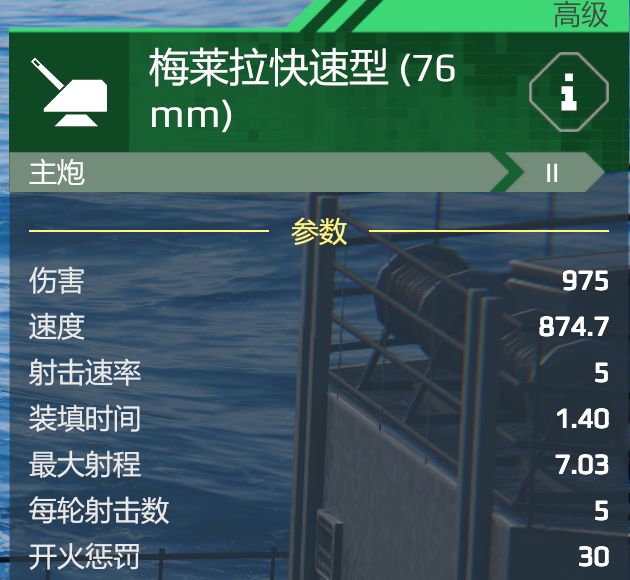 此主炮有着较快的射击速率,以及仅为1.4的装填速度,能快速打出不俗伤害,并且此主炮为高平两用舰炮,可以对空射击,击落直升机和固定翼飞机,每轮射击5发炮弹,有较高击中率。