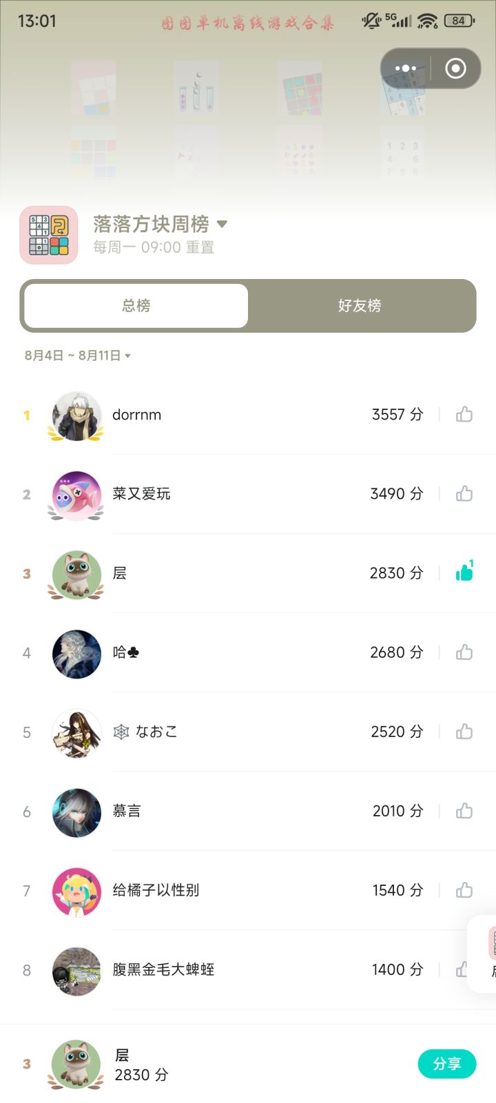 分数越高越靠前,每周一上午9点重置。