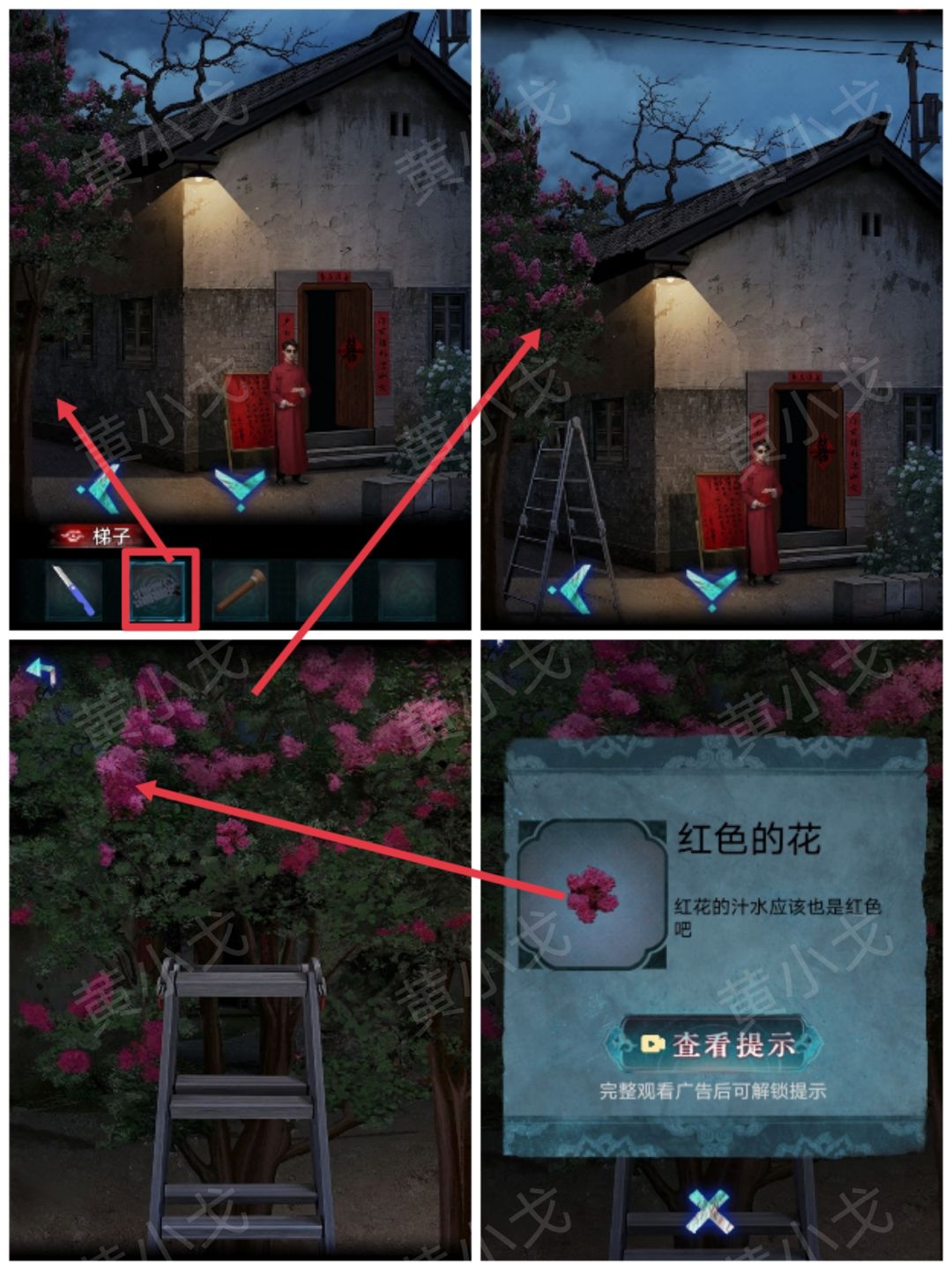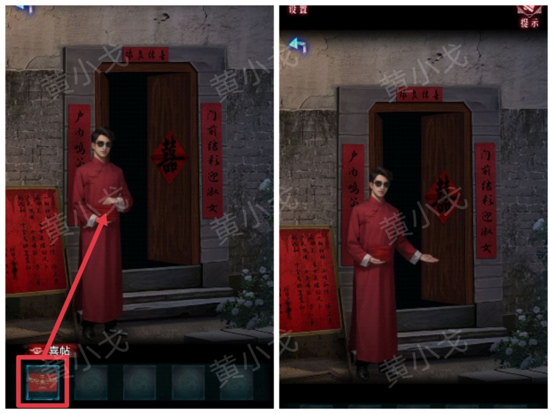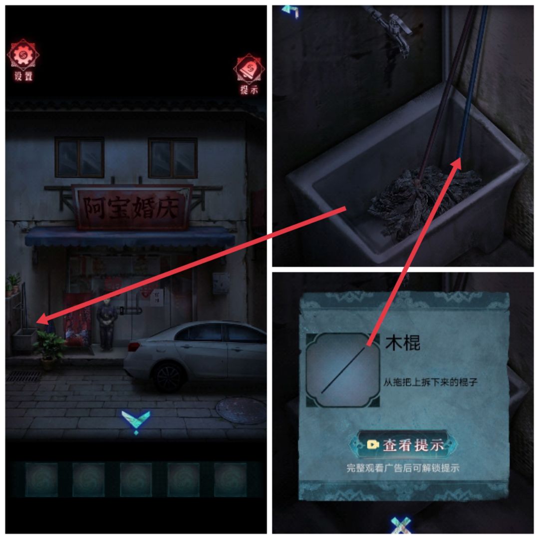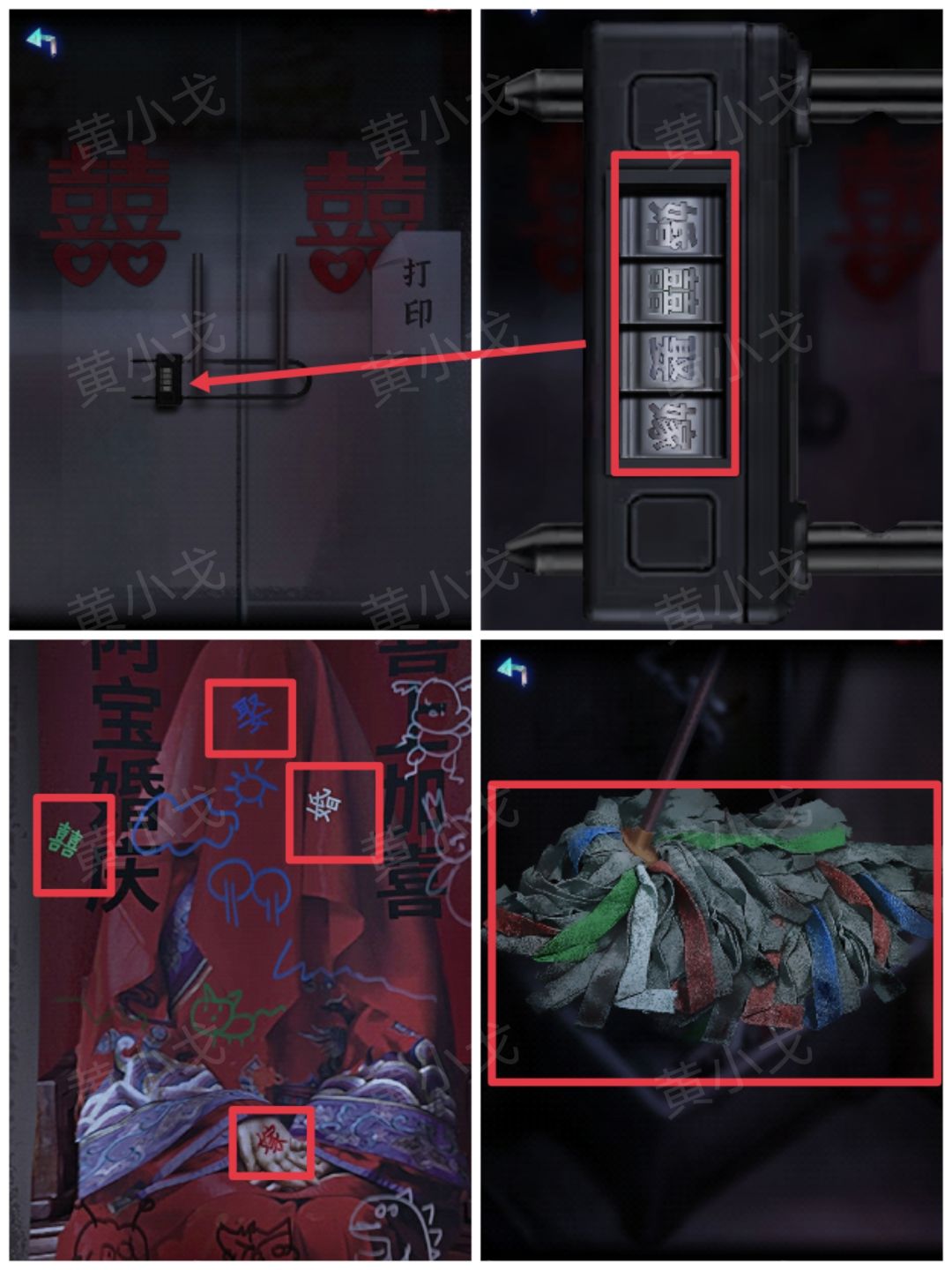 7.点击门上的密码锁,根据拖把和海报上的线索,输入密码:婚囍娶嫁