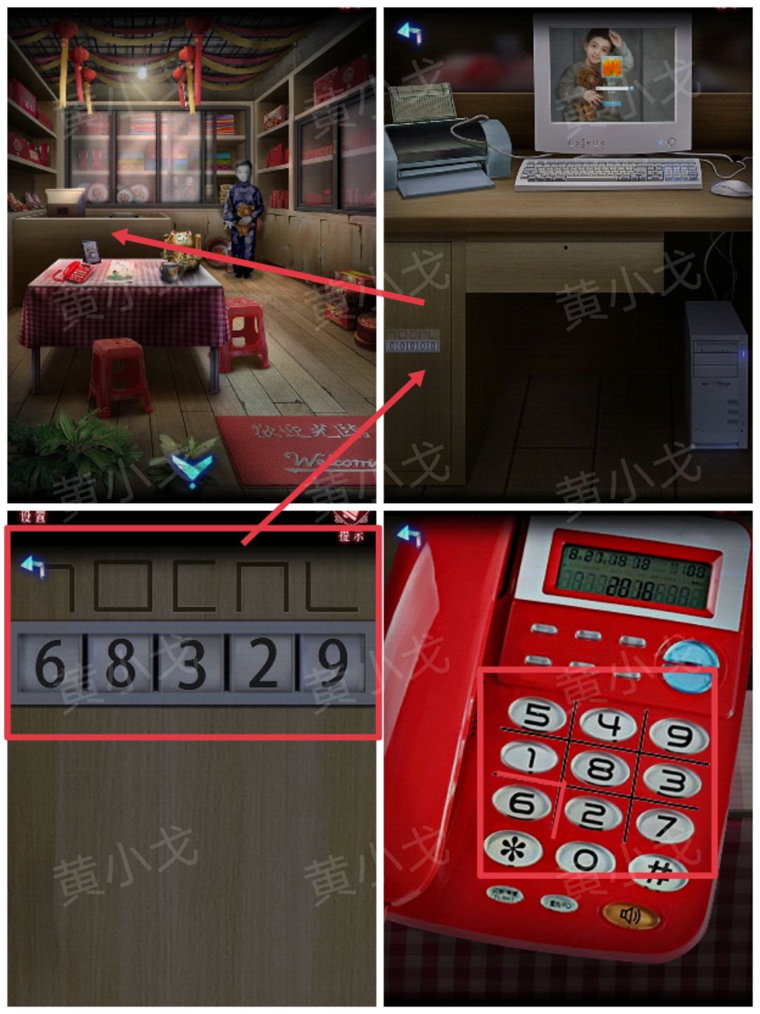 13.点击柜台柜子上的密码锁,根据上面的提示,结合电话键盘上的线索,输入密码:68329