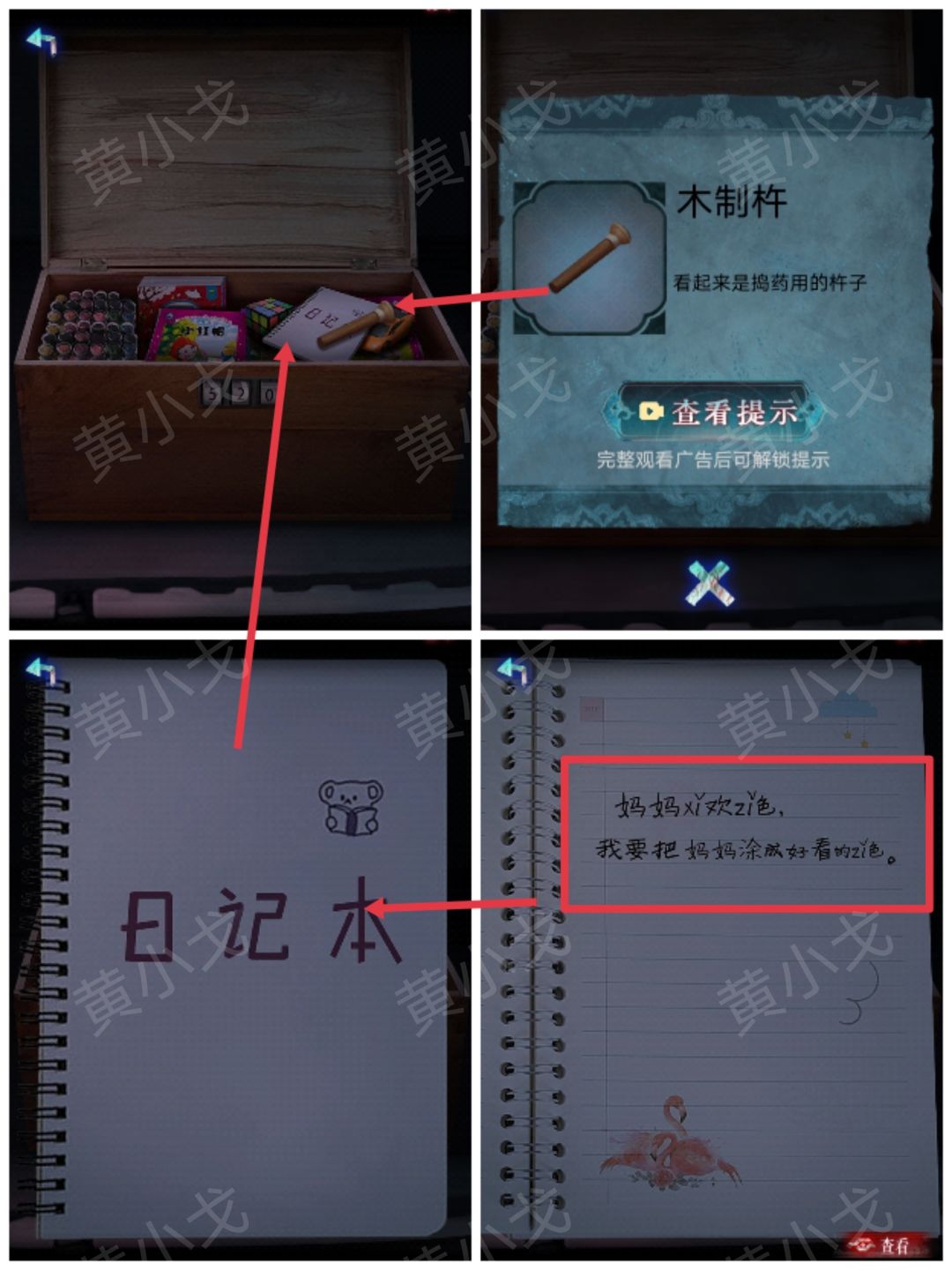 18.打开木箱,获得【木制杵】;查看日记本,获得线索