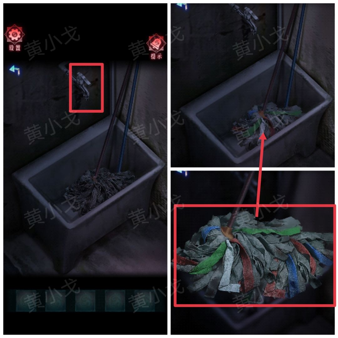 3.打开水龙头冲洗拖把,查看拖把上的布条,获得线索