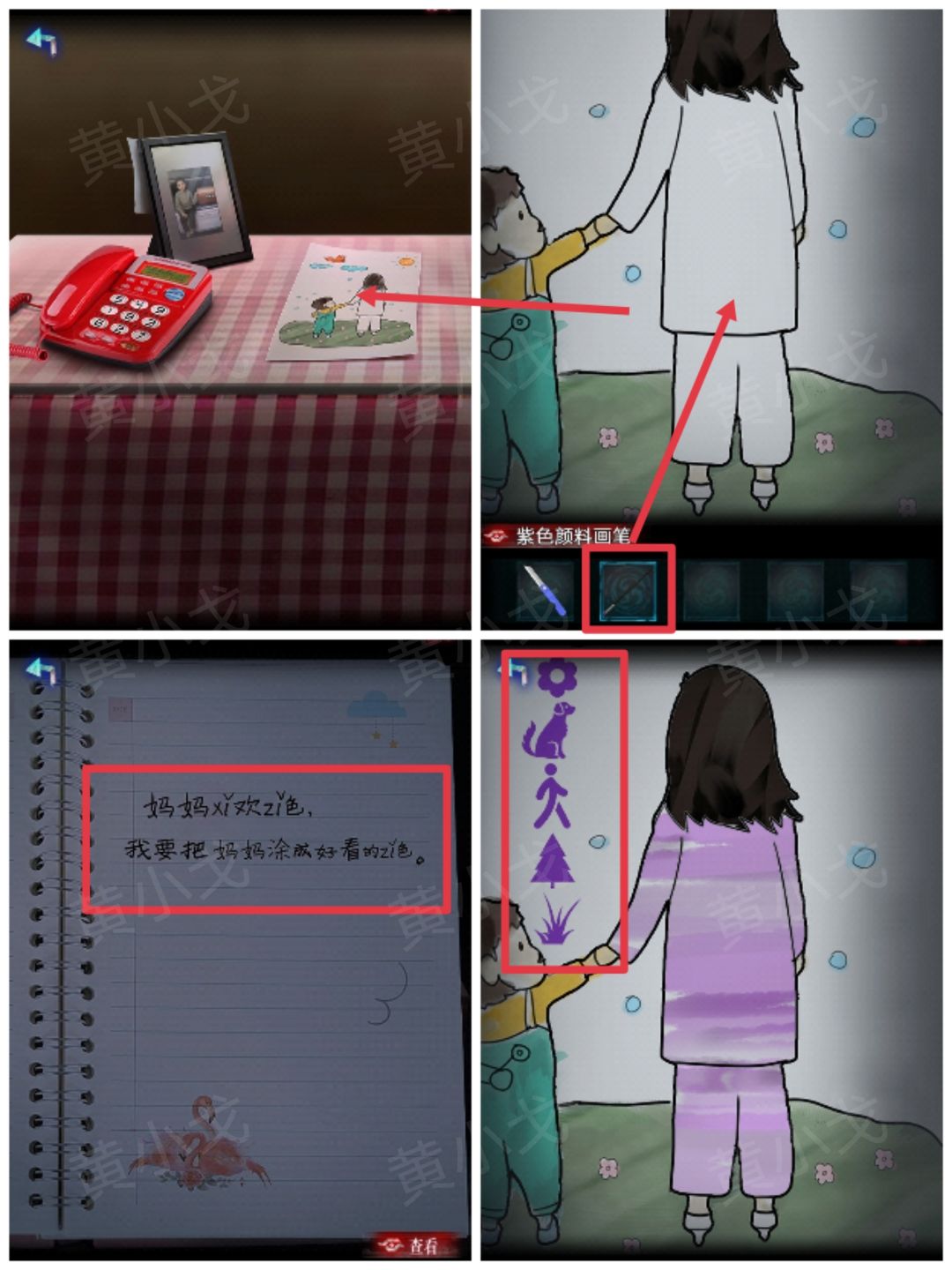 22.点击桌面上的画,根据日记本上的线索,用【紫色颜料画笔】给妈妈上色,获得线索