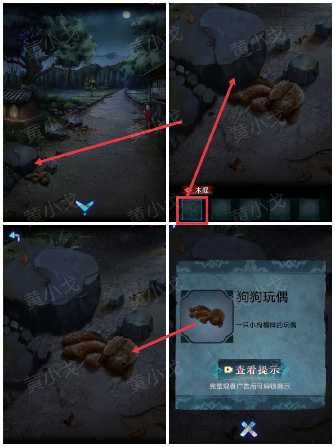 5.点击地上被压住的玩偶,用【木棍】撬开石头,获得【狗狗玩偶】