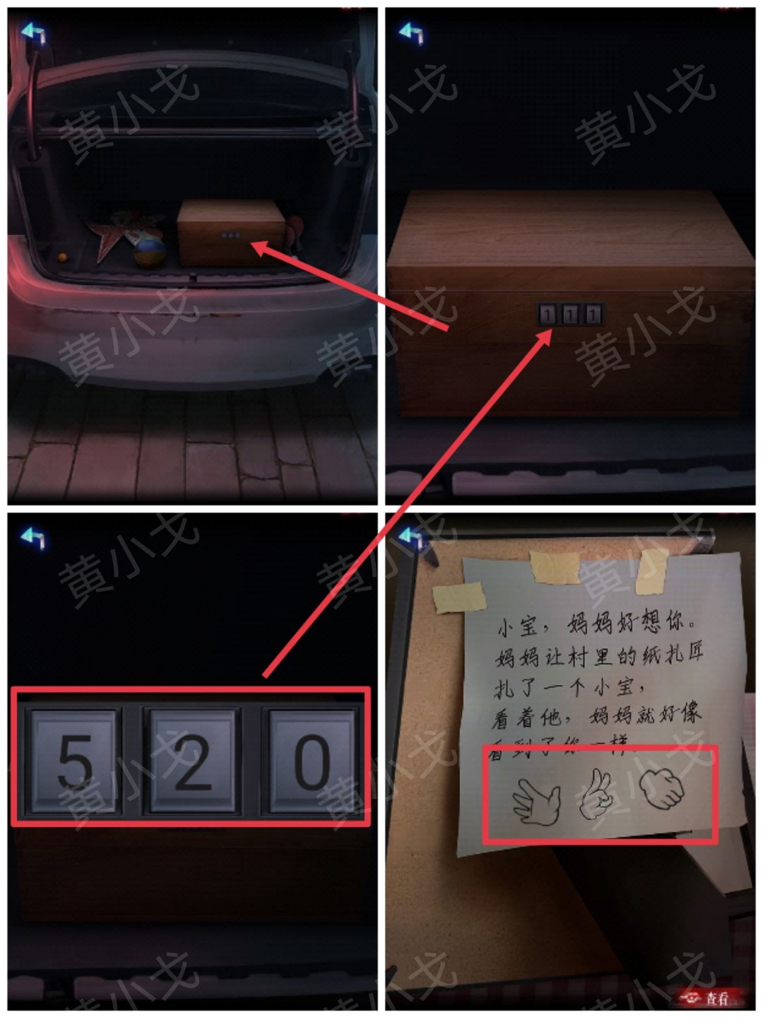 17.点击木箱上的密码锁,根据照片背面的纸条,输入密码:520