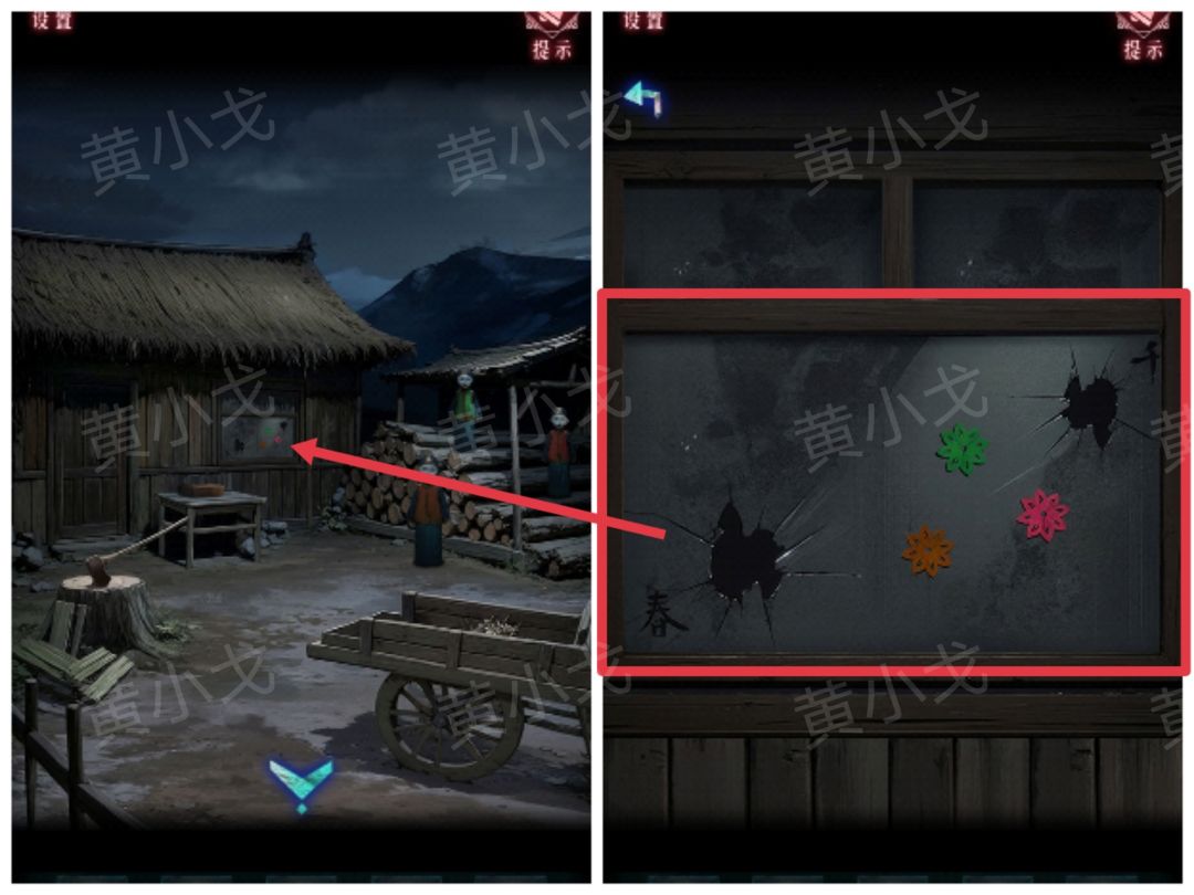 10.点击桌子上的木盒上的密码锁,根据纸人和窗户上的字,调整滑块的位置