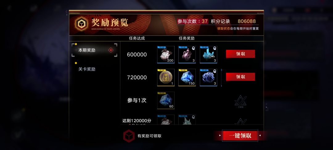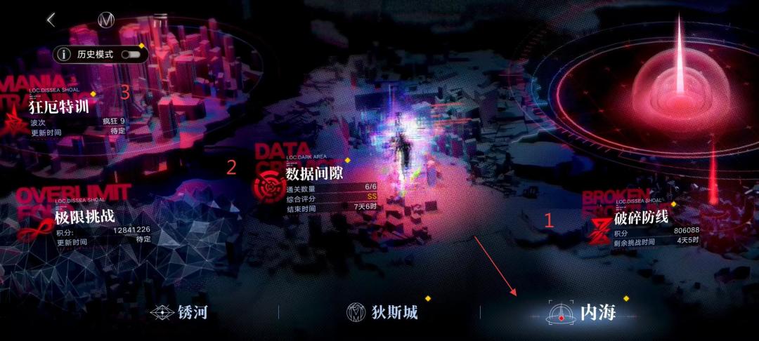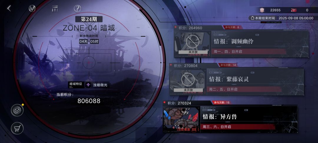 破碎防线:分为低危、中危、高危、暗域。三个关卡总分达到72万下周可进入下一阶段,每个阶段获取异方晶数量也不一样。